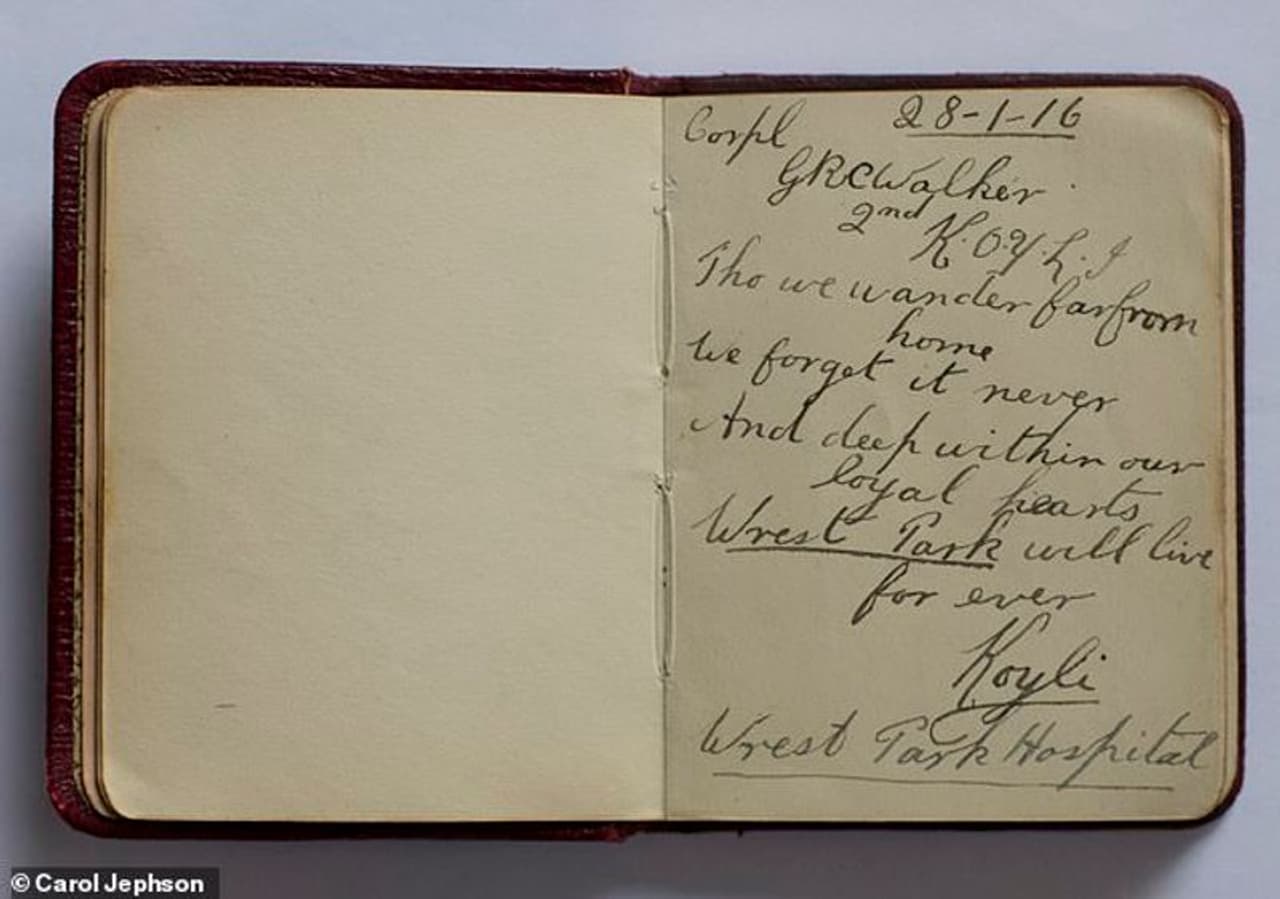 പുസ്തകത്തില് സൈനികരുടെ വിവരങ്ങളും യൂണിറ്റും രേഖപ്പെടുത്തിയിട്ടുണ്ട്. ചിലത് ബുള്ളറിനുള്ള സന്ദേശങ്ങളാണ്, അതില് ചിലത് നര്മ്മം കലര്ന്നതാണെങ്കില് ചിലത് വിശദമായവയാണ്. കരോളിന്റെ കയ്യില് മുത്തശ്ശിയുടെ കയ്യിലുണ്ടായിരുന്ന മറ്റ് ചില ചിത്രങ്ങള് കൂടിയുണ്ട്. അതില്, ആംബുലന്സില്നിന്നും സൈനികരെ ഇറക്കുന്നതും, ഡോക്ടര്മാര് കാര്ഡ് കളിക്കുന്നതുമെല്ലാം കാണാം. ഏതായാലും ഒലിവിനെ തിരിച്ചറിഞ്ഞത് മറ്റ് യുദ്ധകാലനഴ്സുമാരെ തിരിച്ചറിയുന്നതിലേക്കും നയിച്ചിട്ടുണ്ട്.
