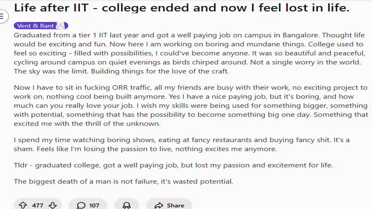 പഠിക്കുമ്പോഴുള്ള ഏറ്റവും വലിയ സ്വപ്നം നല്ല ശമ്പളം കിട്ടുന്ന ജോലിയൊക്കെ വാങ്ങി അടിച്ചുപൊളിച്ച് ജീവിക്കണം എന്നായിരിക്കും. അല്ലെങ്കിൽ, കൂടുതൽ ക്രിയേറ്റീവായി എന്തെങ്കിലും ചെയ്യണം എന്നായിരിക്കും. എന്നാൽ, ജീവിതത്തിൽ അത് അങ്ങനെ തന്നെ സംഭവിക്കണമെന്നില്ല. നല്ല ശമ്പളം കിട്ടിയാലും സന്തോഷം കിട്ടണമെന്നില്ല. അങ്ങനെ ഒരു പോസ്റ്റാണ് ഇപ്പോൾ ശ്രദ്ധിക്കപ്പെടുന്നത്. ഇന്ത്യയിലെ ഏറ്റവും പ്രശസ്തമായ ഐഐടിയിൽ നിന്ന് പഠിച്ചിറങ്ങി, ബെംഗളൂരുവിലെ പ്രമുഖ കമ്പനിയിൽ ഉയർന്ന ശമ്പളമുള്ള ജോലി നേടിയ ഒരു യുവാവാണ് കുറിപ്പ് സോഷ്യൽ മീഡിയയിൽ ഷെയർ ചെയ്തിരിക്കുന്നത്. പഠനകാലത്തെ ആവേശമൊന്നും ജോലി കിട്ടിയപ്പോൾ ലഭിക്കുന്നില്ലെന്നാണ് എഞ്ചിനീയറായ യുവാവിന്റെ പരാതി.