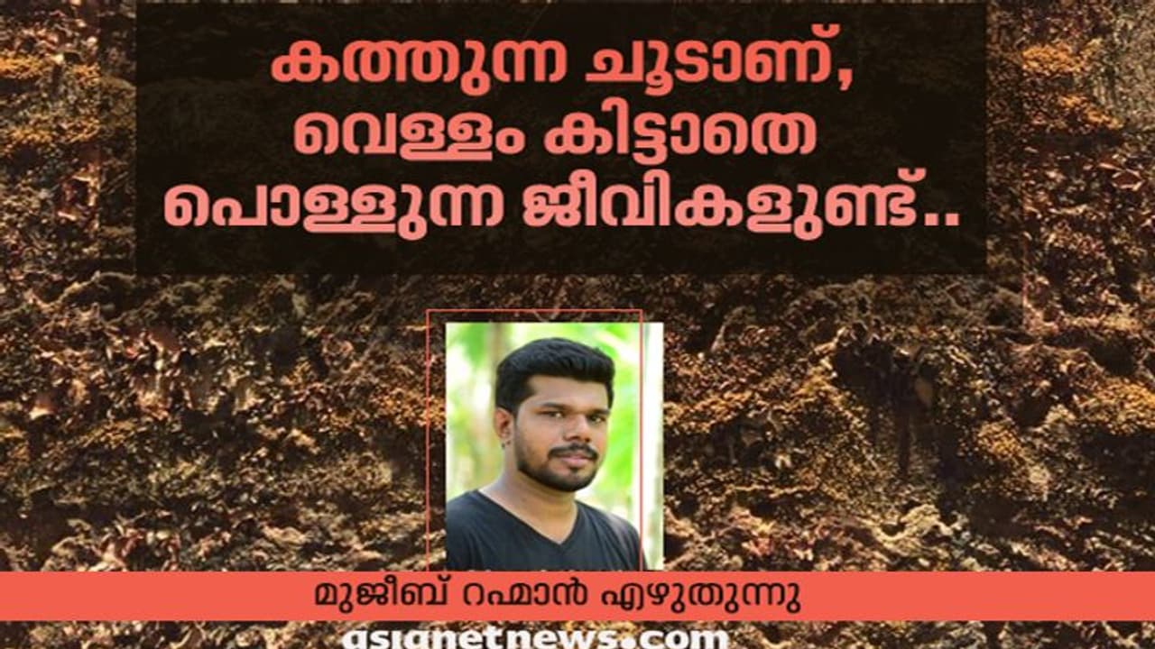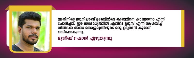 കടുത്ത വേനലാണ്, മീന സൂര്യൻ കത്തിയെരിയുകയാണ്. രാവും പകലും ഒരു പോലെ ചുട്ട് പൊള്ളുന്നു. അതിജീവിക്കാൻ മനുഷ്യനും മൃഗങ്ങളും പാടുപെടുന്ന സമയം. വരണ്ട വേനലിൽ നഗരത്തിരക്കുകളിൽ വാർത്ത തേടിയുള്ള കാത്തിരിപ്പിനിടെ കണ്ട ഒരുടുമ്പിൻ കുഞ്ഞിനെപ്പറ്റി ഞങ്ങളുടെ കാസർകോട് ലേഖകൻ മുജീബ് റഹ്മാൻ എഴുതുന്നു.