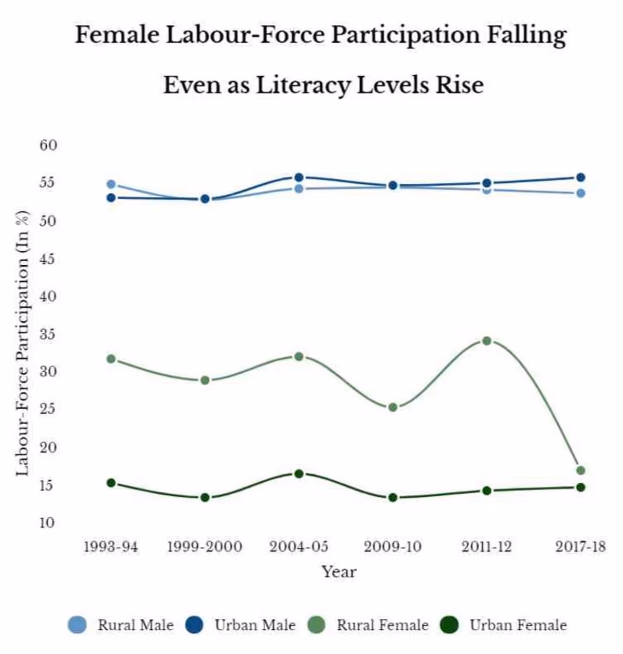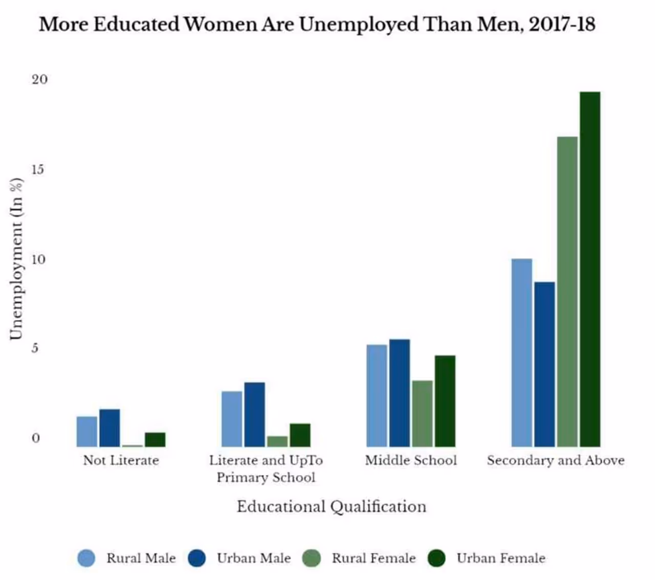 2017-18 കാലങ്ങളില് വിദ്യാഭ്യാസം നേടിയിട്ടും പല സ്ത്രീകളും വീട്ടിലിരുന്നു. അത് തൊഴില്രഹിതരായ പുരുഷന്മാരുടെ എണ്ണത്തേക്കാള് കൂടുതലായിരുന്നുവെന്ന് പീരിയോഡിക് ലേബര് ഫോഴ്സ് സര്വേയുടെ വിവരങ്ങള് പറയുന്നു. ഇന്ത്യയിലെ അവസ്ഥ അനുസരിച്ച് വിദ്യാഭ്യാസം എന്നത് പലപ്പോഴും ജോലിക്കുള്ള കാരണം പോലുമാകുന്നില്ല. പല സ്ഥാപനങ്ങളും നല്കുന്ന നിലവാരമില്ലാത്ത വിദ്യാഭ്യാസം, കുഞ്ഞുങ്ങളെ പരിചരിക്കാനുള്ള സഹായക്കുറവ് എന്നിവയെല്ലാം സ്ത്രീകള് ജോലിക്ക് പോകുന്നതില്നിന്നും തടയുന്നു. പല സ്ത്രീകളും വിവാഹം കഴിയുന്നതോടെയോ കുഞ്ഞുങ്ങളായിക്കഴിയുന്നതോടെയോ ആണ് ജോലി നിര്ത്തി വീട്ടിലിരിക്കുന്നത്. കുഞ്ഞുങ്ങള് വളര്ന്നുകഴിയുമ്പോഴേക്കും പഠിച്ചതെല്ലാം മറക്കുകയും പ്രായം കൂടുകയും ജോലിസാധ്യത കുറയുകയും ചെയ്യുന്നു.