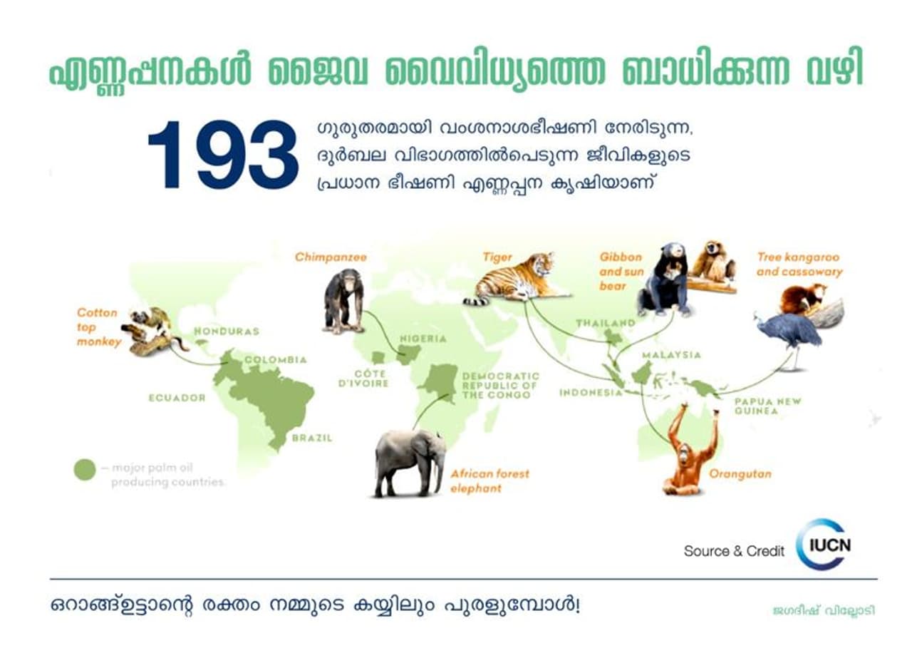 എന്തിന് എന്നല്ലേ? ഇന്തോനേഷ്യയിൽ, ഒറാങ്ഉട്ടാൻ, കടുവ, ആന എന്നിവയുൾപ്പെടെയുള്ള അനേകം വംശനാശ ഭീഷണി നേരിടുന്ന ജീവജാലങ്ങൾ കൊന്നൊടുക്കപ്പെട്ടതും, അത്യപൂർവ സസ്യജാലങ്ങൾ ഉൾപെടുന്ന 1,300 ചതുരശ്ര കിലോമീറ്റർ (2015ലെ കണക്ക്) മഴക്കാടുകൾ നശിപ്പിക്കപ്പെട്ടതും എണ്ണപ്പനക്കൃഷിക്ക് വേണ്ടിയാണ്.