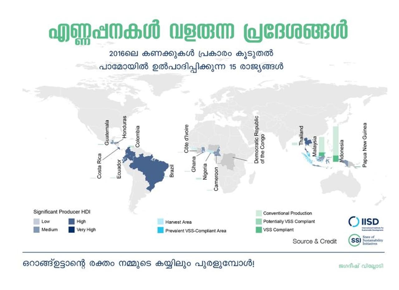 ‘എന്തുകൊണ്ട് പാമോയിൽ?’ എന്ന ചോദ്യത്തിന് ഏറ്റവും ലാഭകരമായ എണ്ണ എന്നാണുത്തരം. ഒരു ഹെക്ടറിനിന്ന് 0.7 ടൺ സൂര്യകാന്തി എണ്ണ ഉൽപാദിപ്പിക്കുമ്പോൾ പാമോയിൽ 3.3 ടൺ വിളവ് ആണ് തരുന്നത്. എല്ലാ പാമോയിലും പ്രശ്നക്കാരാണോ? അല്ല! വനനശീകരണം ഇല്ലാതെ, തികച്ചും പാരിസ്ഥിതികവും സാമൂഹികവുമായ ഉത്തരവാദിത്വത്തോടെ പാമോയിൽ കൃഷി നടത്തുന്നവരുടെ കൂട്ടായ്മ നൽകുന്ന ലേബൽ ആണ് RSPO (Roundtable on Sustainable Palm Oil). ഈ ലേബലുള്ള പാമോയിൽ ഉൽപ്പന്നങ്ങൾ നിങ്ങൾക്ക് സധൈര്യം വാങ്ങാം.