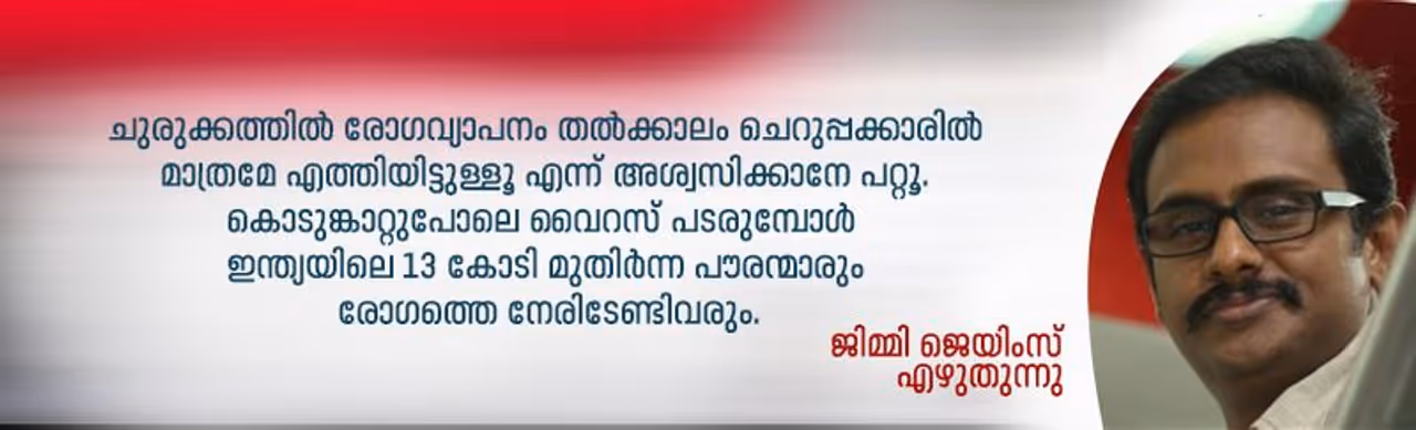 ചുരുക്കത്തിൽ രോഗവ്യാപനം തൽക്കാലം ചെറുപ്പക്കാരിൽ മാത്രമേ എത്തിയിട്ടൂള്ളു എന്ന് ആശ്വസിക്കാനേ പറ്റൂ. കൊടുങ്കാറ്റുപോലെ വൈറസ് പടരുമ്പോൾ ഇന്ത്യയിലെ 13 കോടി മുതിർന്ന പൗരൻമാരും രോഗത്തെ നേരിടേണ്ടിവരും.
