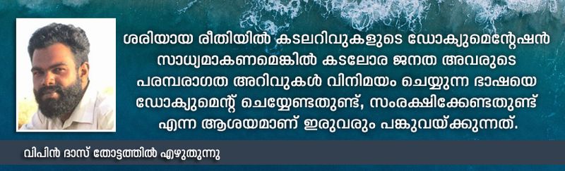 അത്തരത്തിൽ ശരിയായ രീതിയിൽ കടലറിവുകളുടെ ഡോക്യുമെന്റേഷൻ സാധ്യമാകണമെങ്കിൽ കടലോര ജനത അവരുടെ പരമ്പരാഗത അറിവുകൾ വിനിമയം ചെയ്യുന്ന ഭാഷയെ ഡോക്യുമെന്റ് ചെയ്യേണ്ടതുണ്ട്, സംരക്ഷിക്കേണ്ടതുണ്ട് എന്ന ആശയമാണ് ഇരുവരും പങ്കുവയ്ക്കുന്നത്. ഇതിന്റെ അടിസ്ഥാനത്തിൽ രണ്ടുപേരുടേയും പേപ്പർ പ്രസന്റേഷനും തദ്ദേശീയ ഭാഷാ കോൺഫറൻസിൽ നടക്കും.