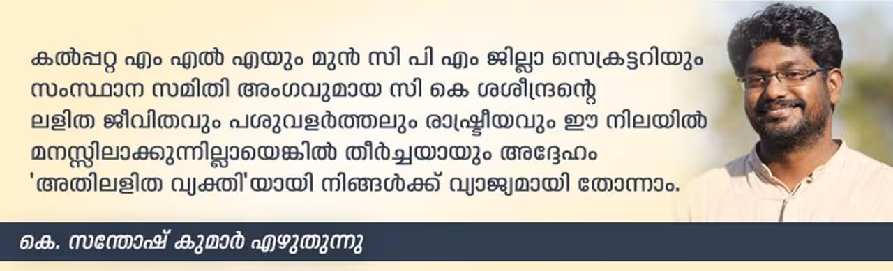 കൽപ്പറ്റ എം എൽ എയും മുൻ സി പി എം ജില്ലാ സെക്രട്ടറിയും സംസ്ഥാന സമിതി അംഗവുമായ സി കെ ശശീന്ദ്രന്റെ ലളിത ജീവിതവും പശുവളർത്തലും രാഷ്ട്രീയവും ഈ നിലയിൽ മനസ്സിലാക്കുന്നില്ലായെങ്കിൽ തീർച്ചയായും അദ്ദേഹം 'അതിലളിത വ്യക്തി'യായി നിങ്ങൾക്ക് വ്യാജ്യമായി തോന്നാം.