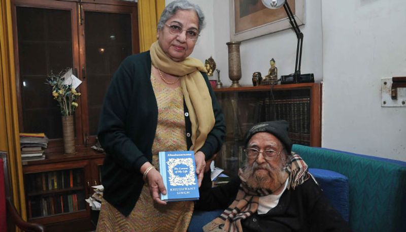'ഖുഷ്വന്ത് സിങ്ങ് ഭാര്യ കവൽ മാലിക്കുമൊത്ത്, കയ്യിൽ അദ്ദേഹത്തിന്റെ ആത്മകഥ, 'ഖുഷ്വന്ത്നാമ'യുടെ പ്രതി. '