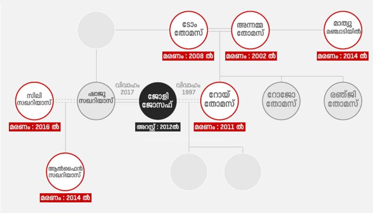 വീട് കിട്ടാൻ വേണ്ടി ഭാര്യാ മാതാവിനെയും, പിതാവിനെയും വധിച്ചു. ഭർത്താവുമായുള്ള ബന്ധം മോശപ്പെട്ടപ്പോൾ അദ്ദേഹത്തെയും, റോയ് തോമസിന്റെ പോസ്റ്റ്മോർട്ടം നടത്തണം എന്ന് വാശിപിടിച്ചപ്പോൾ അമ്മാവൻ മാത്യു മഞ്ചാടിയിലിനെയും ജോളി വധിച്ചു. ഷാജുവുമായി ഒന്നിക്കുന്നതിന് തടസ്സമായി നിന്ന സിലിയെ വധിച്ചു. ഒപ്പം, അവരുടെ രണ്ടുവയസ്സുള്ള കുഞ്ഞിനെയും. ഒടുവിൽ ജോളി അറസ്റ്റിലായി.