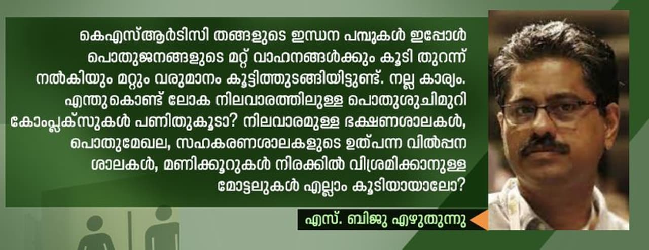 ശബരിമല സീസണായിട്ടും അവസ്ഥ ഇങ്ങനെയെങ്കിൽ? കെഎസ്ആർടിസി തങ്ങളുടെ ഇന്ധന പമ്പുകൾ ഇപ്പോൾ പൊതുജനങ്ങളുടെ മറ്റ് വാഹനങ്ങൾക്കും കൂടി തുറന്ന് നൽകിയും മറ്റും വരുമാനം കൂട്ടി തുടങ്ങിയിട്ടുണ്ട്. നല്ല കാര്യം. എന്തുകൊണ്ട് ലോക നിലവാരത്തിലുള്ള പൊതുശുചിമുറി കോംപ്ലക്സുകൾ പണിതു കൂടാ? നിലവാരമുള്ള ഭക്ഷണശാലകൾ, പൊതുമേഖല, സഹകരണശാലകളുടെ ഉത്പന്ന വിൽപ്പന ശാലകൾ, മണിക്കൂറുകൾ നിരക്കിൽ വിശ്രമിക്കാനുള്ള മോട്ടലുകൾ എല്ലാം കൂടിയായാലോ? കുടുംബശ്രീ, സുലഭ് പോലുള്ള ശൗചാലയ സ്ഥാപനങ്ങൾ, കെടിഡിസി, എന്നിവർക്കൊക്കെ പങ്കാളികളാകാം. കേരള വിനോദ സഞ്ചാര വികസന കോർപ്പറേഷനുകളുടെ വഴിയോാര ഇടത്താവളമായ മോട്ടൽ ആരാം നല്ല മാതൃകയാണ്. പൊതുവിൽ വൃത്തിയുള്ള ശുചിമുറികളാണ് വഴിയോരത്തെ ഈ കേന്ദ്രങ്ങളിലേക്ക് യാത്രക്കാരെ ആകർഷിക്കുന്നത്. എന്നാൽ, ഇവയുടെ എണ്ണം തുലോം കുറവാണ്. വിദേശങ്ങളിൽ ദീർഘദൂര ബസ്സുകളിൽ ശുചിമുറികളുണ്ട്. സൂപ്പർ ക്ളാസ്സിലെങ്കിലും ഇത് നമുക്ക് പരീക്ഷിച്ചു കൂടെ?