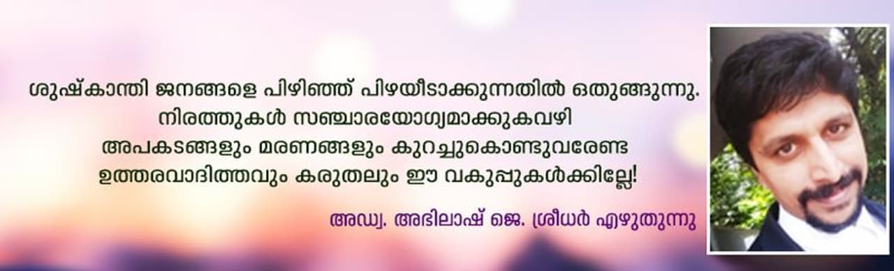 ശുഷ്കാന്തി ജനങ്ങളെ പിഴിഞ്ഞ് പിഴയീടാക്കുന്നതിൽ ഒതുങ്ങുന്നു. നിരത്തുകൾ സഞ്ചാരയോഗ്യമാക്കുകവഴി അപകടങ്ങളും മരണങ്ങളും കുറച്ചുകൊണ്ടുവരേണ്ട ഉത്തരവാദിത്തവും കരുതലും ഈ വകുപ്പുകൾക്കില്ലേ!