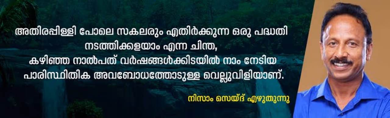 സൈലന്റ് വാലിസമരം പോലെ, തുടക്കത്തിൽ ജനപിന്തുണ ഒട്ടുമില്ലാതിരുന്ന ഒരു മുന്നേറ്റം പോലും അതിന്റെ ഉദ്ദേശ്യശുദ്ധിയുടെ പുറത്ത് വേരുപിടിച്ച കേരളത്തിന്റെ രാഷ്ട്രീയപ്രബുദ്ധമായ മണ്ണിൽ, അതിരപ്പിള്ളി പോലെ സകലരും എതിർക്കുന്ന ഒരു പദ്ധതി നടത്തിക്കളയാം എന്ന ചിന്ത, കഴിഞ്ഞ നാല്പത് വർഷങ്ങൾക്കിടയിൽ നാം നേടിയ പാരിസ്ഥിതിക അവബോധത്തോടുള്ള വെല്ലുവിളിയാണ്.