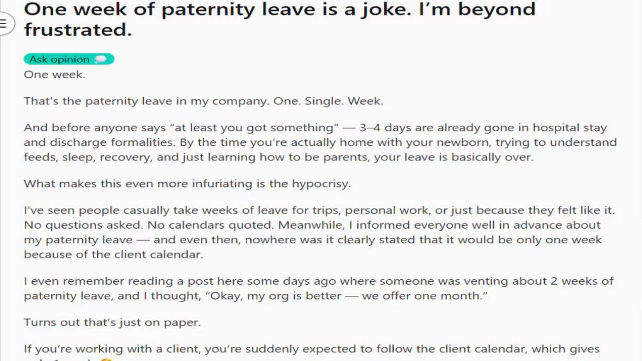 ഒരു മാസം ലഭിക്കേണ്ട പിതൃത്വ അവധി, ക്ലയന്റുമായി ബന്ധപ്പെട്ട ജോലി ചെയ്യുന്നതിനാൽ കമ്പനി ഒരാഴ്ചയായി വെട്ടിക്കുറച്ചെന്ന് യുവാവ്. അവധി വെട്ടിച്ചുരുക്കിയത് ക്രൂരമാണെന്നും മനുഷ്യത്വമില്ലായ്മയാണ് എന്നും യുവാവ് കുറിച്ചിരിക്കുന്നത് കാണാം.