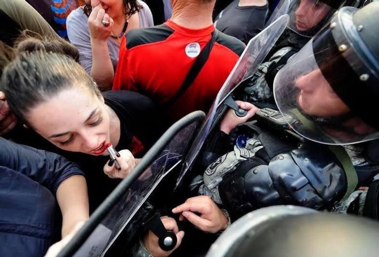 ഇന്ന്, സ്ത്രീ ശാക്തീകരണത്തിനായുള്ള മറ്റ് പ്രതിഷേധ ചിഹ്നങ്ങൾ വ്യാപകമായി. പ്രത്യേകിച്ച് 2017 വനിതാ മാർച്ചിൽ ആധിപത്യം പുലർത്തിയ പിങ്ക് പുസി ഹാറ്റ്. പിങ്ക് നിറത്തിലുള്ള തൊപ്പിയായിരുന്നു അതില് പ്രധാനം. എന്നിട്ടും ചുവന്ന ചുണ്ടുകൾക്ക് എപ്പോഴും അതിന്റേതായ പ്രാധാന്യമുണ്ട്.. 2015 -ലെ ഒരു വൈറൽ ചിത്രത്തിൽ, സർക്കാർ വിരുദ്ധ പ്രതിഷേധത്തിനിടെ ഒരു മാസിഡോണിയൻ സ്ത്രീ ഒരുദ്യോഗസ്ഥന്റെ പ്രതിഷേധക്കാരെ തടയാനുപയോഗിച്ച ഷീല്ഡ് കണ്ണാടിയാക്കി ലിപ്സ്റ്റിക്കെഴുതുന്നത് കാണാം. അവിടെയും സ്ത്രീയുടെ ചുവന്ന ചുണ്ടുകള് കരുത്തിന്റെ പ്രതീകമായി.