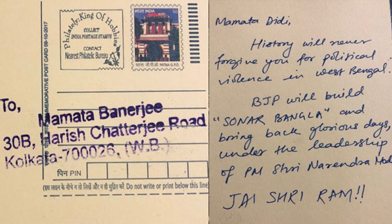 മോദിയുടെ ജയത്തിനു പിന്നാലെ മമതാ ദീദിയ്ക്കയച്ച പോസ്റ്റുകാർഡിൽ ഉജ്ജ്വൽ പരീഖ് കുറിച്ചത്, " നിങ്ങൾ ബംഗാളിൽ അഴിച്ചുവിട്ടുകൊണ്ടിരിക്കുന്ന രാഷ്ട്രീയ അക്രമങ്ങളുടെ പേരിൽ ചരിത്രം നിങ്ങൾക്ക് ഒരിക്കലും മാപ്പുതരില്ല. നരേന്ദ്ര മോദി എന്ന കർമ്മധീരന്റെ നേതൃത്വത്തിൽ ബിജെപി 'സോനാർ ബംഗ്ളാ' തിരിച്ചു കൊണ്ടുവരിക തന്നെ ചെയ്യും.. " എന്നായിരുന്നു.