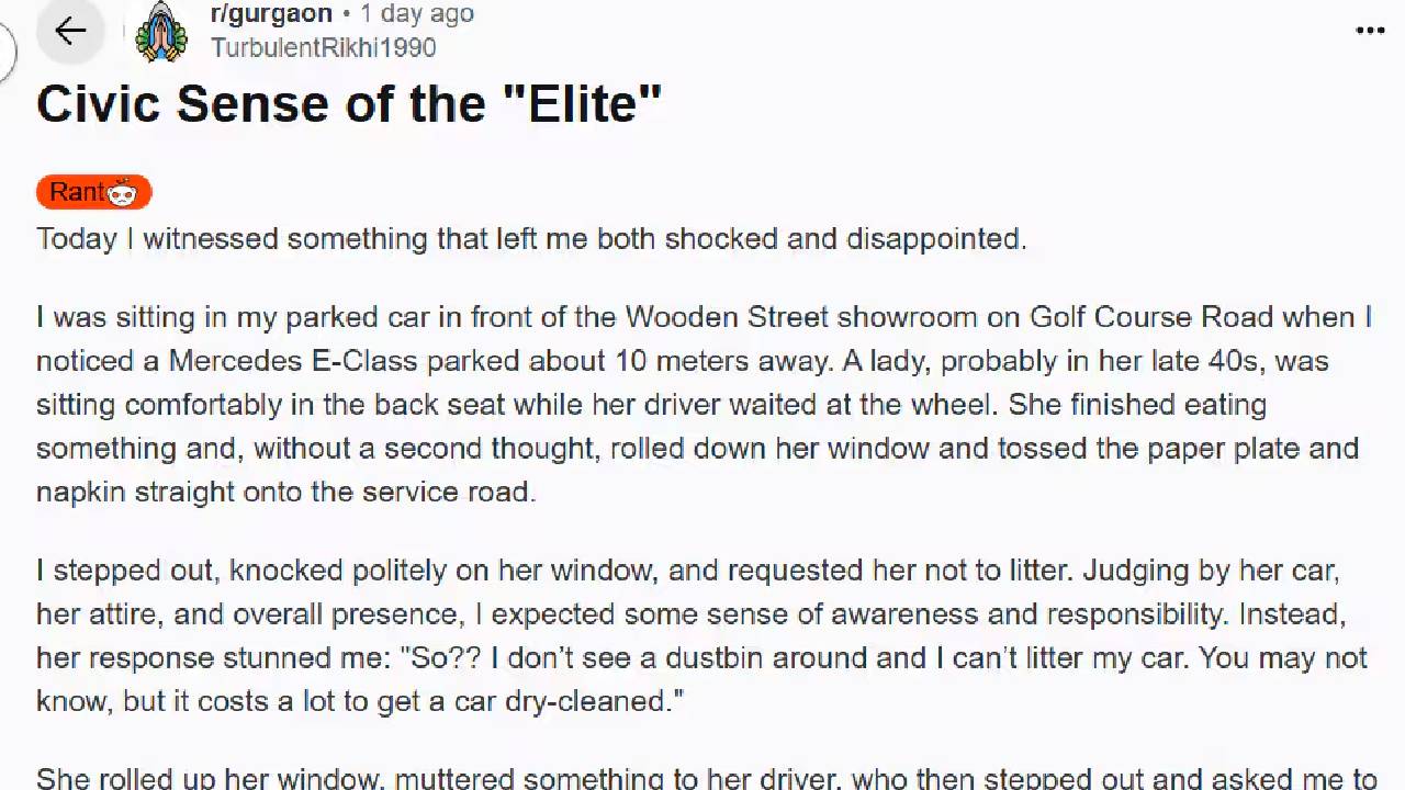 ഗുരുഗ്രാമിലെ ഏറ്റവും തിരക്കേറിയ റോഡുകളിലൊന്നായ ഗോൾഫ് കോഴ്സ് റോഡിലാണ് സംഭവം നടന്നത്. തൻ്റെ അനുഭവം പങ്കുവെച്ച യുവാവ് പറയുന്നതനുസരിച്ച്, ഒരു ആഡംബര കാർ സർവീസ് റോഡിൽ നിർത്തിയിട്ടിരിക്കുന്നത് അദ്ദേഹം ശ്രദ്ധിച്ചു. ഡ്രൈവിംഗ് സീറ്റിൽ ഒരു ഡ്രൈവറും പിന്നിൽ ഒരു സ്ത്രീയും ഉണ്ടായിരുന്നു. ഭക്ഷണം കഴിച്ചതിന് ശേഷം, ആ സ്ത്രീ കാറിൽ നിന്ന് ഉപയോഗിച്ച നാപ്കിനുകളും പേപ്പർ പ്ലേറ്റുകളും റോഡിലേക്ക് വലിച്ചെറിഞ്ഞു. ഈ കാഴ്ച തനിക്ക് ഏറെ അസ്വസ്ഥത ഉണ്ടാക്കിയെന്നാണ് റെഡിറ്റ് ഉപയോക്താവ് പോസ്റ്റിൽ കുറിക്കുന്നത്.