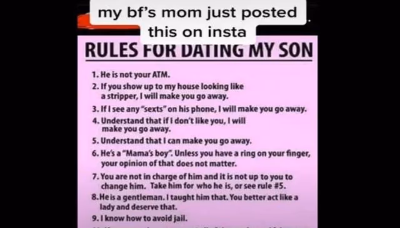 വളരെ വിചിത്രമായ പല പോസ്റ്റുകളും നമ്മൾ സോഷ്യൽ മീഡിയയിൽ കാണാറുണ്ട്. അതുപോലെ അങ്ങേയറ്റം വിചിത്രം എന്ന് തോന്നുന്ന ഒരു പോസ്റ്റാണ് ഇതും. തന്റെ മകനെ പ്രണയിക്കുന്ന പെൺകുട്ടിക്ക് വേണ്ടി അമ്മ തയ്യാറാക്കിയ '10 നിയമ'ങ്ങളാണ് ഈ പോസ്റ്റിൽ ഉള്ളത്.