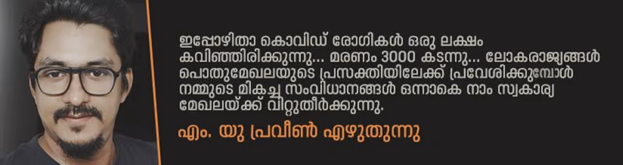 ഇപ്പോഴിതാ കൊവിഡ് രോഗികൾ ഒരു ലക്ഷം കവിഞ്ഞിരിക്കുന്നു... മരണം 3000 കടന്നു... ലോകരാജ്യങ്ങൾ പൊതുമേഖലയുടെ പ്രസക്തിയിലേക്ക് പ്രവേശിക്കുമ്പോൾ നമ്മുടെ മികച്ച സംവിധാനങ്ങൾ ഒന്നാകെ നാം സ്വകാര്യ മേഖലയ്ക്ക് വിറ്റുതീർക്കുന്നു. സ്വന്തം പാർട്ടിയിലെ തൊഴിലാളി സംഘടന എതിർത്തിട്ടു പോലും ധനികർക്കുവേണ്ടി ദരിദ്രരുടെ എല്ലിനുള്ളിലെ മാംസം പോലും വിൽക്കാൻ വെച്ച നമുക്ക് എന്ത് മരണവേദന?