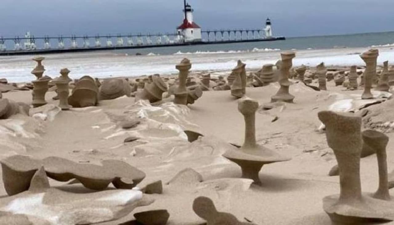 യുഎസ്സിലെ മിഷിഗൺ തടാകത്തി(Lake Michigan)ന്റെ തീരത്ത് ഉയർന്നുവന്ന നിഗൂഢമായ രൂപങ്ങളുടെ ചിത്രങ്ങളാണിവ. റിപ്പോർട്ടുകൾ പ്രകാരം, ലാൻഡ്സ്കേപ്പ്, നേച്ചർ ഫോട്ടോഗ്രാഫർ(Landscape and nature photographer) ജോഷ്വ നോവിക്കി(Joshua Nowicki)യാണ് ഈ ചിത്രങ്ങൾ പങ്കുവച്ചത്. അദ്ദേഹം മുമ്പ് പ്രകൃതിയുടെ ഇതുപോലെയുള്ള വിവിധ പ്രതിഭാസങ്ങളുടെ നിരവധി ചിത്രങ്ങൾ പങ്കിട്ടിരുന്നു. എന്നാൽ, ഈ വർഷത്തെ ഈ രൂപങ്ങളാണ് താൻ കണ്ടതിൽ വച്ച് ഏറ്റവും വലിയ രൂപങ്ങളെന്ന് അദ്ദേഹം പറയുന്നു.