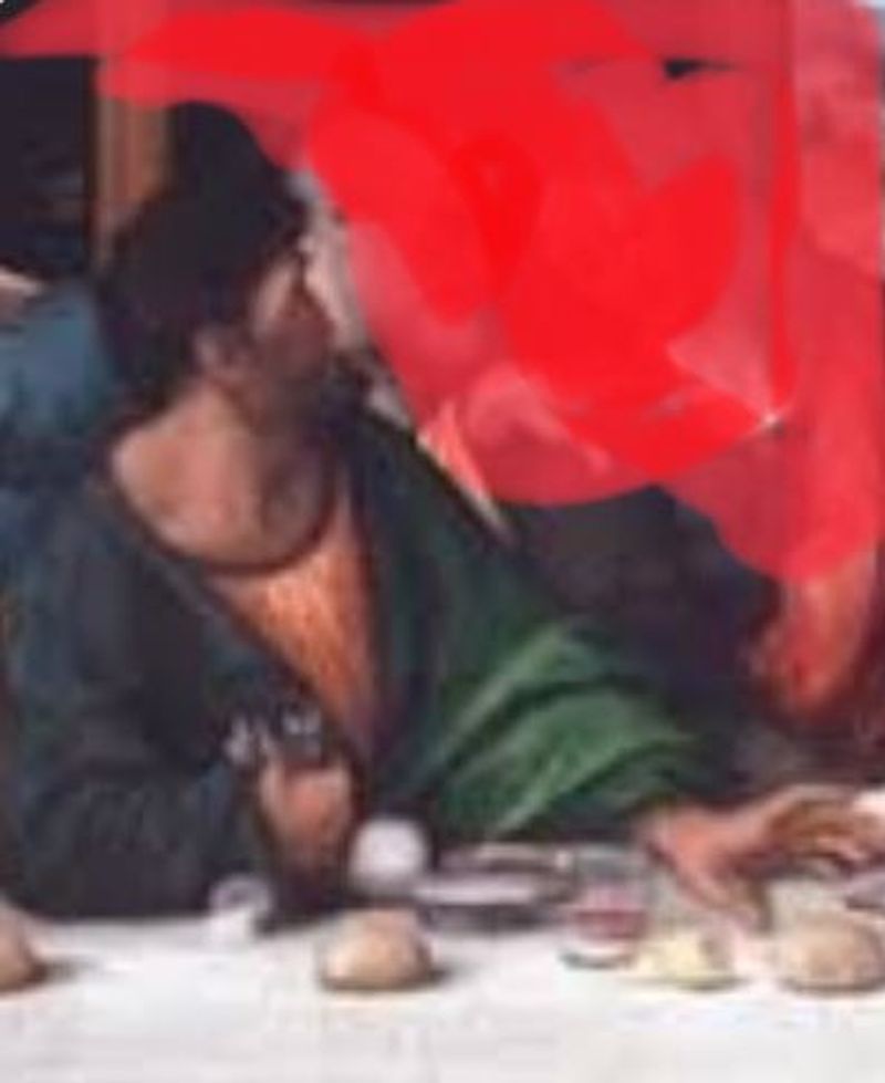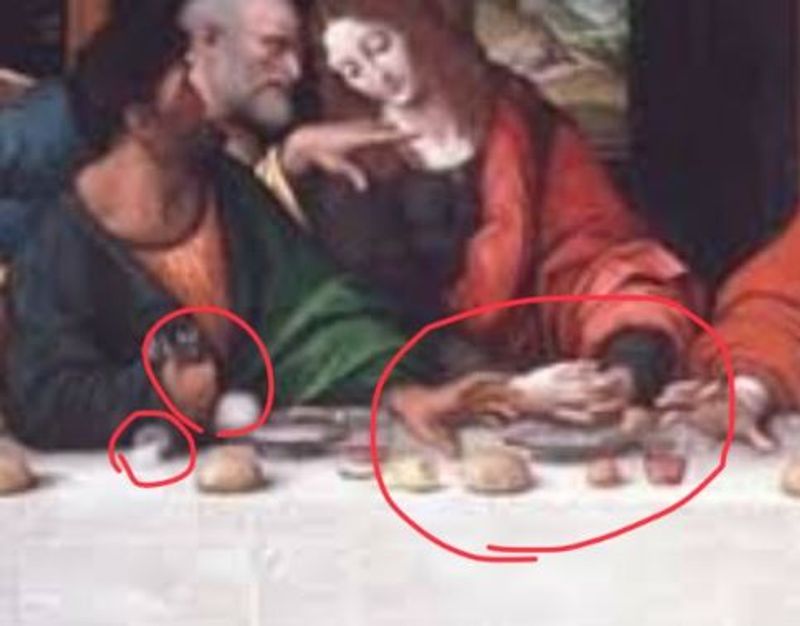 യൂദാസിന്റെ കൈ തട്ടി ഉപ്പു പാത്രം ടേബിളിൽ മറിയുന്നുണ്ട്. നന്ദിയില്ലാത്തവൻ എന്ന് സൂചിപ്പിക്കാൻ. അയാൾ ഒരു കൈയിൽ പണക്കിഴി ഒളിപ്പിക്കാൻ ശ്രമിക്കുന്നുമുണ്ട്. അയാളുടെ ഒരു കൈ യേശുവിന്റെ വീഞ്ഞ് പാത്രത്തിലേക്ക് നീളുന്നു ഇതാണ് പിന്നീട് യേശു എന്റെ രക്തമാണ് എന്ന് പറഞ്ഞത്.