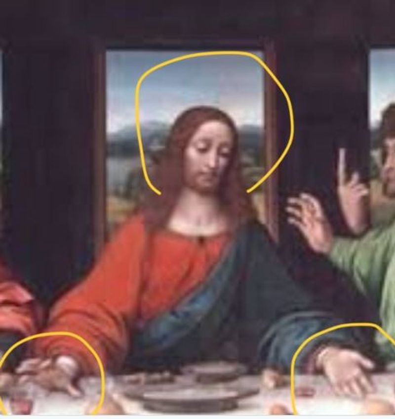 പൊതുവെ എല്ലാ ചിത്രങ്ങളും ഉള്ളത് പോലെ യേശുവിനു തലയ്ക്കു ചുറ്റും പ്രഭാവലയം ഇതിൽ വരച്ചിട്ടില്ല. യേശുവിന്റെ ഒരു കൈ അപ്പത്തിലേക്കും അടുത്തത് വീഞ്ഞിലേക്കും നീളുന്നുണ്ട് ഇതെന്റെ രക്തമാണ് ഇതെന്റെ മാംസവും എന്ന് അവ ഉയർത്തി അടുത്തതായി പറയാൻ പോകുന്നു എന്നതാണ് അത് സൂചിപ്പിക്കുന്നത്.
