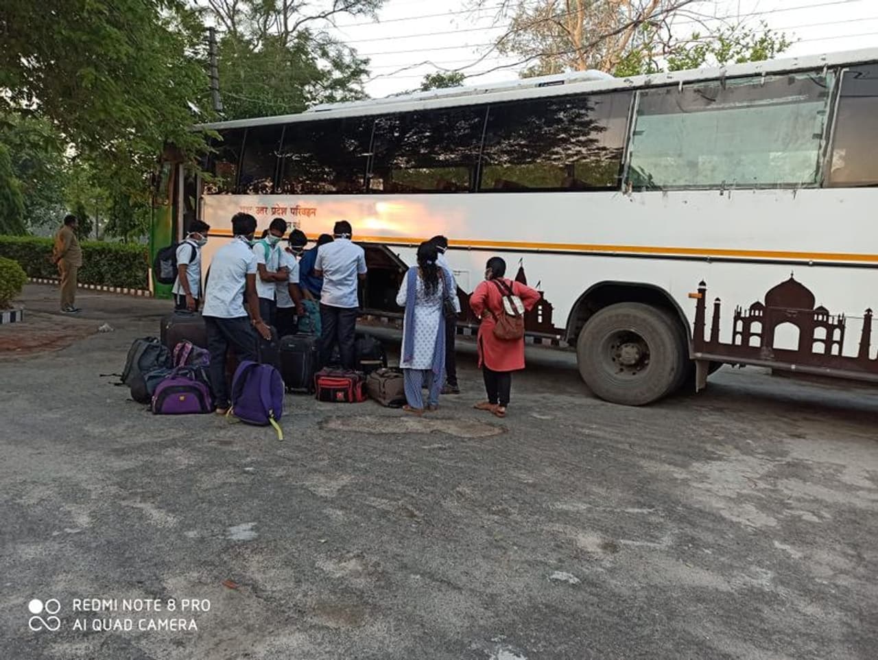 മെയ് 7 -ന് രാവിലെ അഞ്ച് മണിക്ക് ഉത്തർപ്രദേശ് റോഡ് ട്രാൻസ്പോർട്ടിന്റെ നീളമുള്ള ഒരു എ.സി. ബസ്സ് വിദ്യാലയാങ്കണത്തിൽ എത്തി. കാക്കിയണിഞ്ഞ രണ്ട് ഡ്രൈവർമാരും നീല യൂണിഫോമണിഞ്ഞ ഒരു ക്ലീനറും ഒപ്പം. ലോക് ഡൗണിൽ പെട്ട് വീട്ടിൽ പോകാനാകാതെ ക്യാമ്പസിൽ കുടുങ്ങിപ്പോയ ചില അദ്ധ്യാപക അനധ്യാപകരും കുടുംബാംഗങ്ങളും ഞങ്ങളെ യാത്രയാക്കാനെത്തി. പ്രിൻസിപ്പാൾ പച്ചക്കൊടി വീശി ബസ്സിന് യാത്രാനുമതി നൽകി. തിരിഞ്ഞുനോക്കുമ്പോൾ ഞങ്ങളുടെ നീണ്ട യാത്രയും അതിൽ നേരിടാൻ പോകുന്ന വൈഷമ്യങ്ങളും കാലേക്കൂട്ടി കണ്ടതിൽ കുണ്ഠിതപ്പെട്ട് നിൽക്കുന്ന രഞ്ജൻ സാറും, സ്വതസിദ്ധമായ നിറചിരിയുമായി കൈവീശി നിൽക്കുന്ന നവീൻ സാറും നേർത്ത സങ്കടത്താൽ കണ്ണുതുടക്കുന്ന മേട്രൻ ഇന്ദ്രാവതി മാഡവും ഇനി എനിക്കും ഇവിടെ നിന്ന് രക്ഷപ്പെടാമല്ലോ എന്ന ആശ്വാസത്തോടെ പുഞ്ചിരിച്ച് കൈ വീശി നിൽക്കുന്ന കൗൺസിലർ ഹർഷിതയും കൺമുന്നിൽ നിന്ന് പിന്നിലേക്ക് ഓടിമറഞ്ഞു.