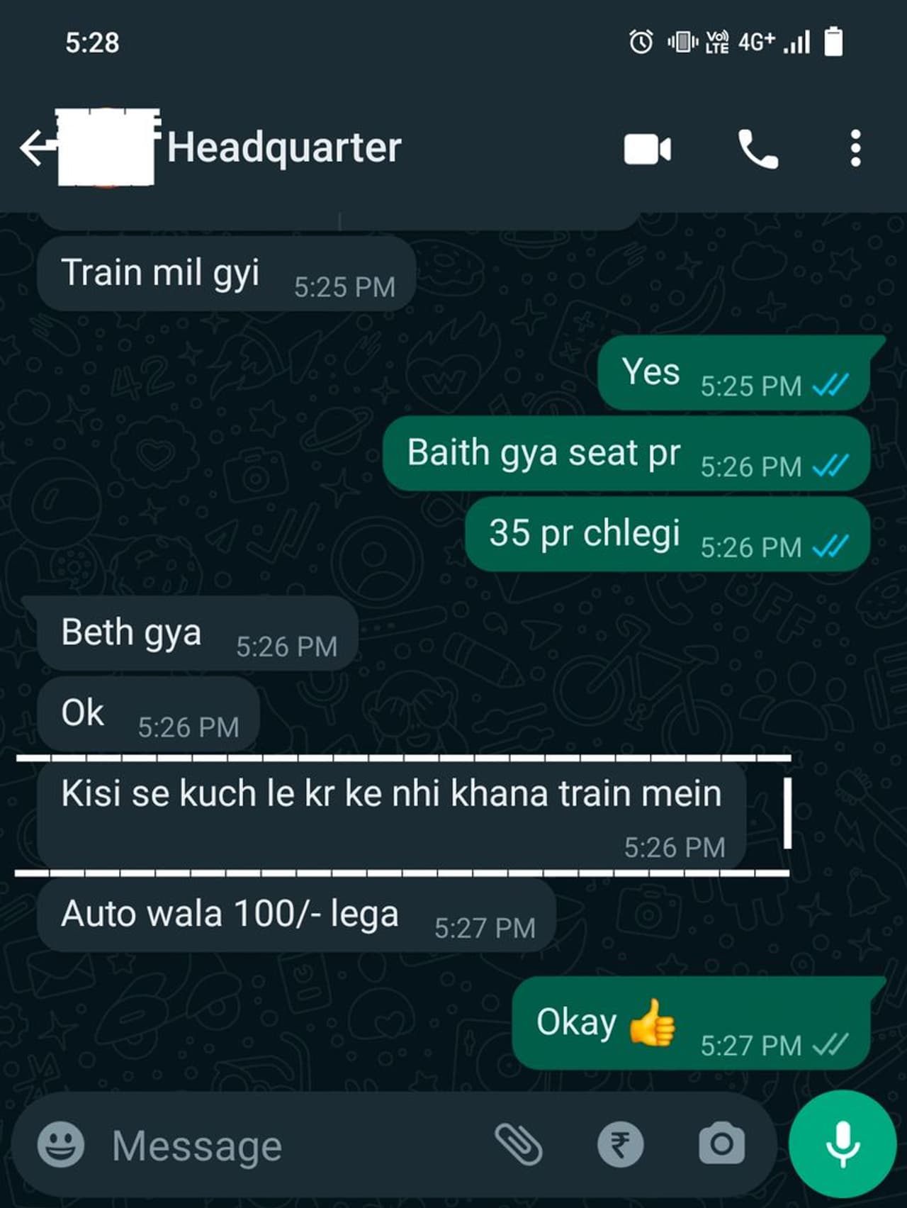 'ഇന്ത്യൻ മാതാപിതാക്കൾ, താൻ 22 വയസുള്ള ആളാണ്' എന്ന് യുവാവ് പോസ്റ്റിന് കാപ്ഷൻ നൽകിയിട്ടുണ്ട്. ചാറ്റ് ഗ്രൂപ്പിന്റെ പേര് 'ഹെഡ്ക്വാർട്ടർ' എന്നാണ്. ചാറ്റിൽ, യുവാവിനോട് മാതാപിതാക്കൾ 'ട്രെയിനിൽ കയറിയോ' എന്നാണ് ആദ്യം ചോദിക്കുന്നത്. 'കയറി, സീറ്റ് കിട്ടി, ട്രെയിൻ 5.35 -ന് എടുക്കും' എന്ന് യുവാവ് മറുപടി നൽകുന്നുണ്ട്. 'ട്രെയിനിൽ ആരിൽ നിന്നും ഭക്ഷണം വാങ്ങി കഴിക്കരുത്' എന്നാണ് മാതാപിതാക്കളുടെ അടുത്ത ഉപദേശം.