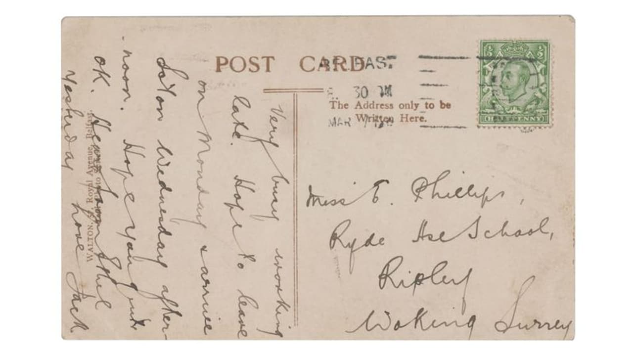 ഇപ്പോഴിതാ, ടൈറ്റാനിക് മുങ്ങുന്നതിന് ആഴ്ചകള്ക്ക് മുമ്പ് അതിലെ ഒരു ജീവനക്കാരനെഴുതിയ പോസ്റ്റുകാര്ഡ് ലേലത്തിന് വച്ചിരിക്കുകയാണ്. $15,000 (ഏകദേശം 1114506.12 രൂപ ) രൂപയാണ് കാർഡിന് ലേലത്തില് കിട്ടും എന്ന് പ്രതീക്ഷിക്കുന്നത്. കപ്പലിന്റെ സീനിയർ വയർലെസ് ഓപ്പറേറ്ററായ ജാക്ക് ഫിലിപ്സ് തന്റെ സഹോദരി എൽസിക്ക് എഴുതിയതാണ് ഈ പോസ്റ്റ്കാർഡ്. 1912 മാർച്ചിൽ ടൈറ്റാനിക് നിർമ്മിച്ച അയർലണ്ടിലെ ബെൽഫാസ്റ്റിലെ തുറമുഖത്ത് ആയിരിക്കുമ്പോഴാണ് ഇത് എഴുതപ്പെട്ടത് എന്ന് കരുതുന്നു. മാർച്ച് അവസാനമാണ് കപ്പലിന്റെ നിർമ്മാണം പൂർത്തിയാകുന്നത്. 1912 ഏപ്രിൽ രണ്ടിന് അത് പുറപ്പെട്ടു.