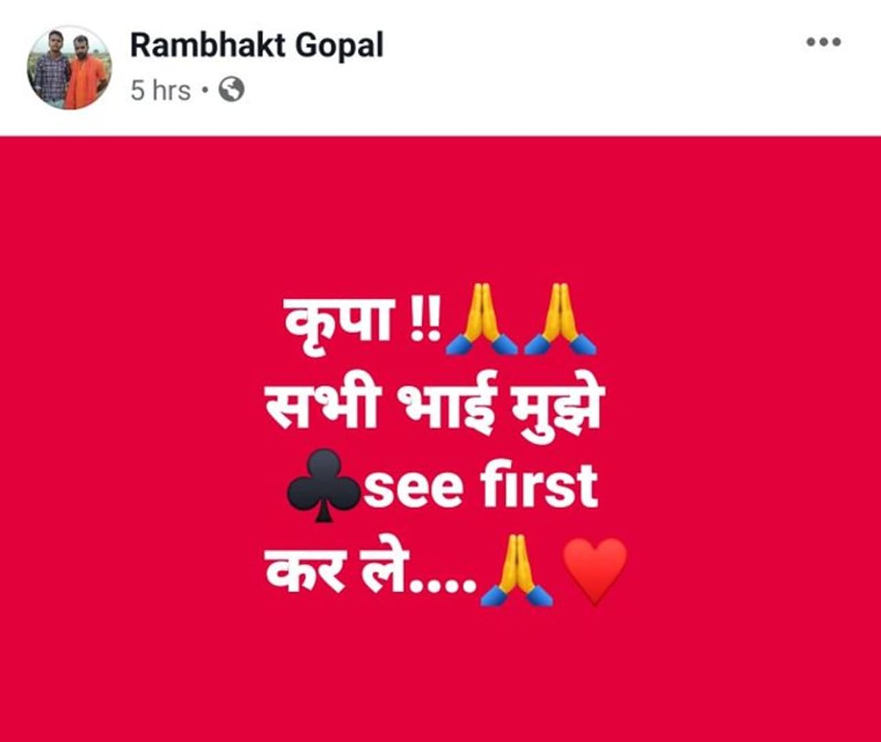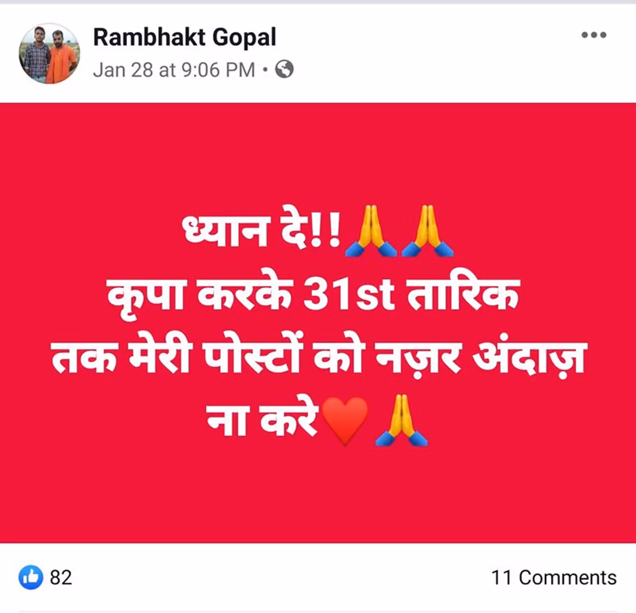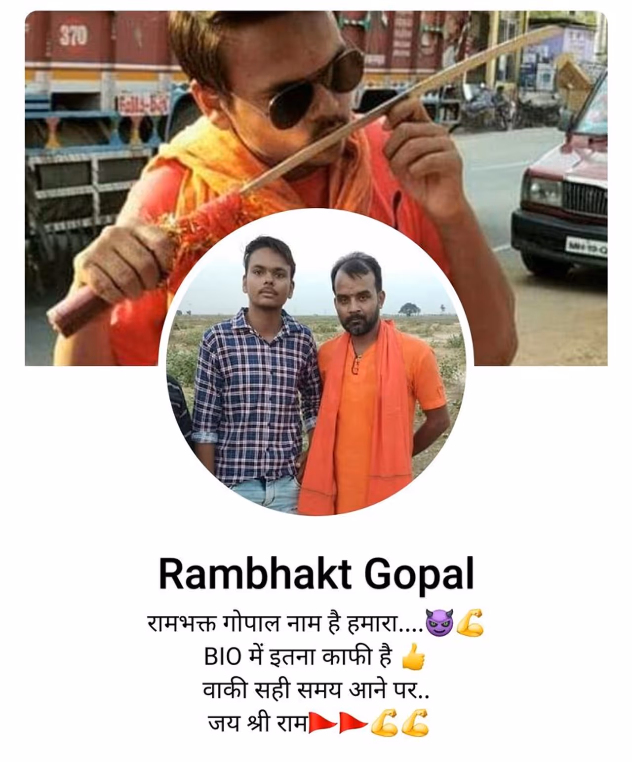 "എന്റെ പേര് രാം ഭക്ത് ഗോപാൽ, തല്ക്കാലം ഇത്ര മതി, ബാക്കി വഴിയേ അറിഞ്ഞോളും " ഇതാണ് കയ്യിൽ ഒരു വാളുമേന്തിക്കൊണ്ട് നിൽക്കുന്ന അയാളുടെ ഫേസ്ബുക്ക് പ്രൊഫൈലിലെ ബയോ.