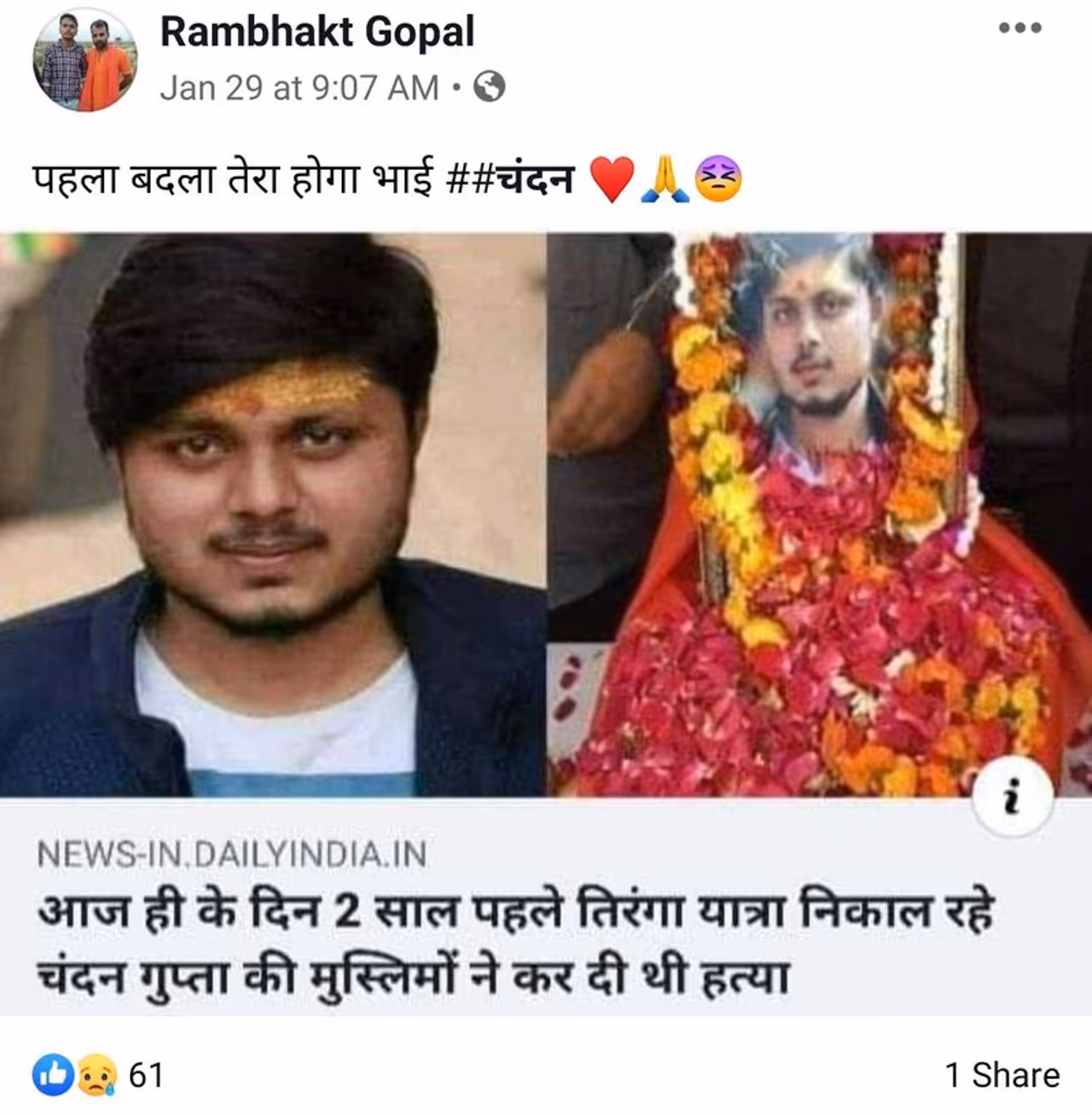 ജനുവരി 29 -ന് രാവിലെ 9 മണിക്ക് അയാൾ വീണ്ടും പോസ്റ്റിട്ടു, " ആദ്യത്തെ പ്രതികാരം നിങ്ങൾക്കുവേണ്ടിയാണ് ചന്ദൻ ഭായി". ഒപ്പം പങ്കുവെച്ച ചിത്രത്തിൽ മുസ്ലീങ്ങളാൽ കൊല്ലപ്പെട്ടത് എന്ന് ഗോപാൽ സംശയിക്കുന്ന ഒരാളുടെ ചിത്രവുണ്ടായിരുന്നു.