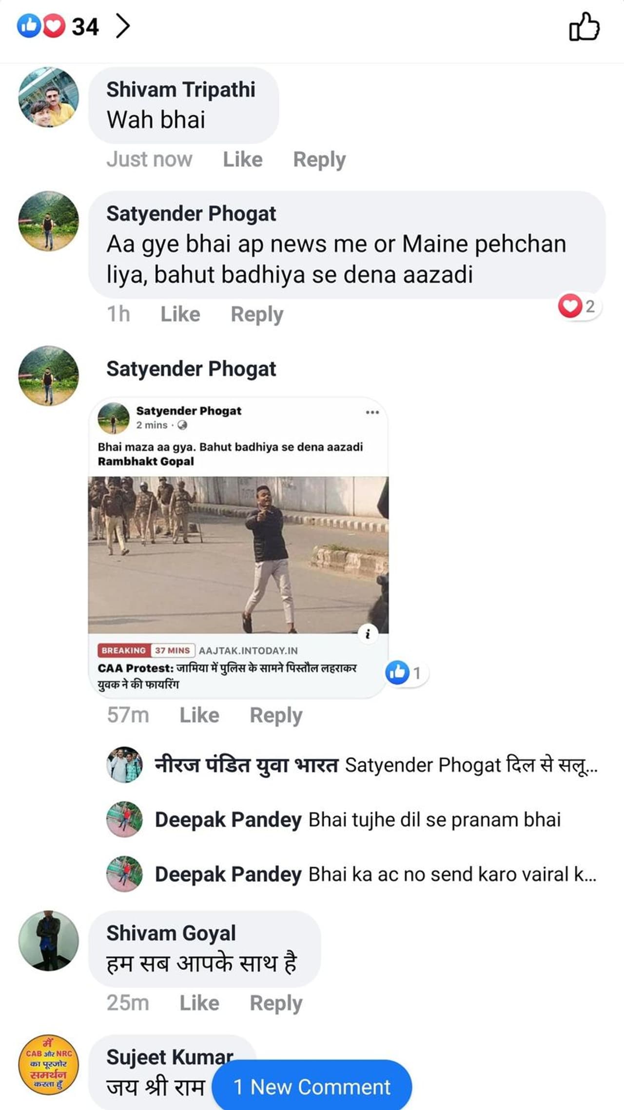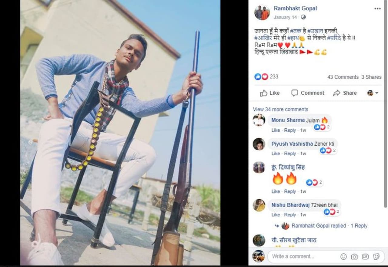 വെടിവെക്കുന്നതിന് മുമ്പുള്ള മൂന്നുമണിക്കൂറിനിടെ അയാൾ ഫേസ്ബുക്കിൽ ലൈവായത് ഏഴുവട്ടം. അതിനിടെ 'ഇവിടെ ഹിന്ദു മീഡിയ ആരെയും കാണുന്നില്ല' എന്നും, 'എന്റെ വീട്ടുകാരെ നോക്കണേ' എന്നും അയാൾ പോസ്റ്റിട്ടു. 'ആസാദി കൊടുക്കാൻ പോകുന്നു' എന്നും