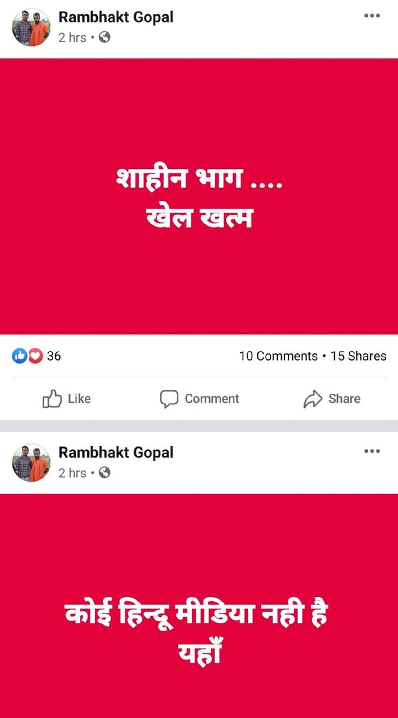 റാം ഭക്ത് ഗോപാലിന്റെ പേരിലുള്ള ഫേസ്ബുക്ക് പോസ്റ്റിൽ നിന്ന് കഴിഞ്ഞ കുറച്ചു ദിവസങ്ങളായി വന്ന പോസ്റ്റുകൾ പരിശോധിച്ചാൽ ഈ ആക്രമണം നിമിഷ നേരത്തെ പ്രകോപനത്തിന്റെ പുറത്തുണ്ടായതല്ല എന്ന് വ്യക്തമാകും