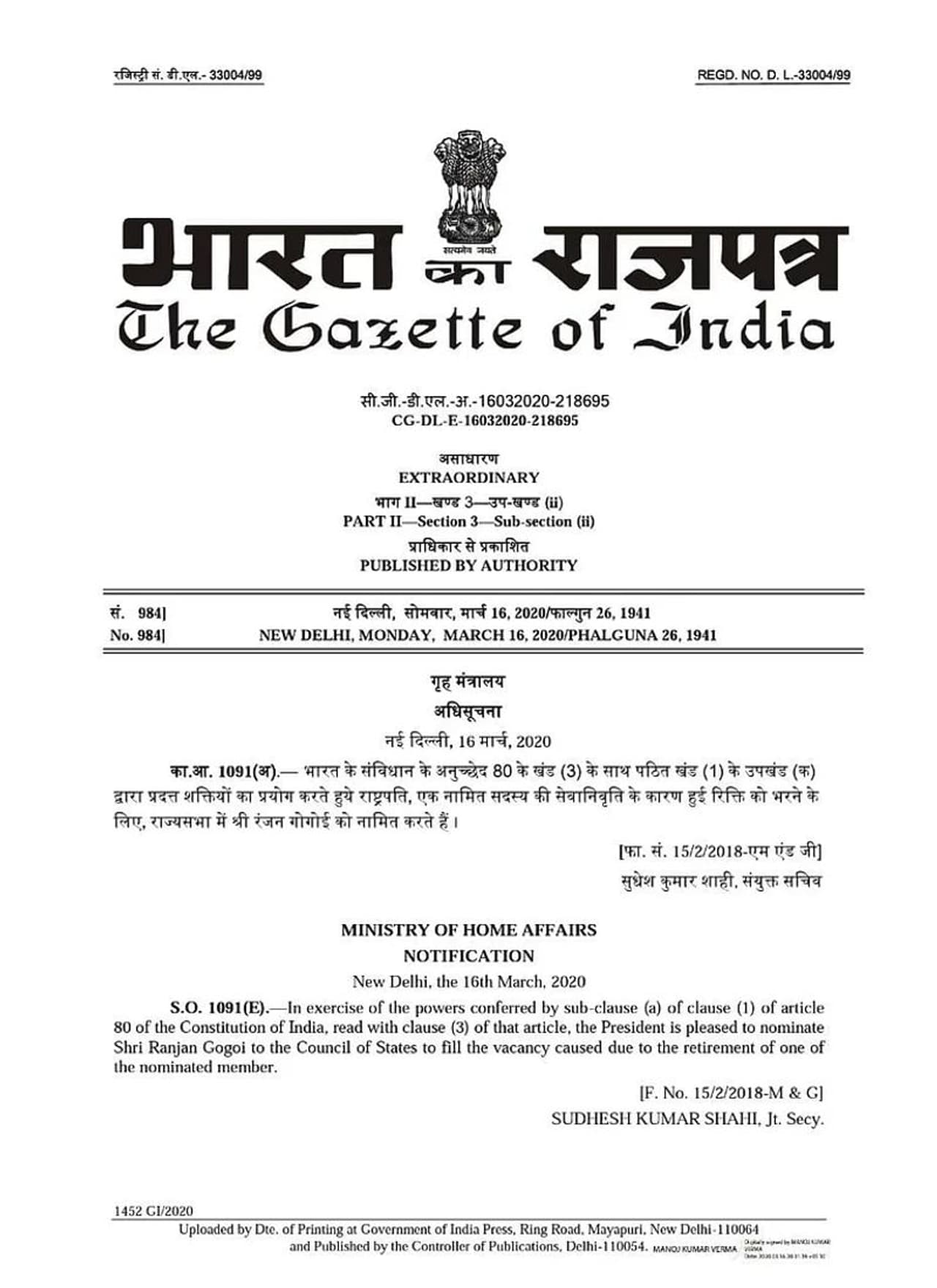 മുൻ സുപ്രീം കോടതി ചീഫ് ജസ്റ്റിസ് രഞ്ജൻ ഗൊഗോയിയെ രാഷ്ട്രപതി റാം നാഥ് കോവിന്ദ് രാജ്യസഭയിലേക്ക് നാമനിർദ്ദേശം ചെയ്തിരിക്കുകയാണ്. ഭരണഘടനയുടെ 80 -ാം വകുപ്പ് പ്രകാരം ഇന്ത്യൻ പ്രസിഡന്റിന് സാഹിത്യം, ശാസ്ത്രം, സാമൂഹ്യസേവനം എന്നിവയിലേതിലെങ്കിലുമൊക്കെ വിശേഷജ്ഞാനമോ പ്രവൃത്തിപരിചയമോ ഉള്ള 12 വ്യക്തികളെ രാജ്യസഭയിലേക്ക് നാമനിർദേശം ചെയ്യാൻ അധികാരമുണ്ട്. പ്രസ്തുത അധികാരം വിനിയോഗിച്ചുകൊണ്ടാണ് രാഷ്ട്രപതിക്കുവേണ്ടി ആഭ്യന്തര മന്ത്രാലയം തിങ്കളാഴ്ച ഈ ഉത്തരവിറക്കിയിട്ടുള്ളത്.