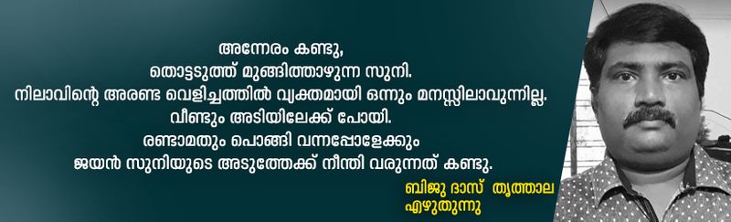 അന്നേരം, മണികണ്ഠേട്ടനും മറ്റ് രണ്ട് പേരും കൂടി സുനിയെ താങ്ങിയെടുത്ത് കൊണ്ടുവന്നു. പ്രത്യേകിച്ച് കുഴപ്പമൊന്നുമില്ല. കുറച്ച് വെള്ളം കുടിച്ചെന്നേയുള്ളൂ. തൃത്താലയില് ആധാരമെഴുതുന്ന രാജേട്ടനാണ് കൈ നീട്ടി എന്നെ പിടിച്ച് കയറ്റിയത്. പിന്നെ കൂടെയുള്ളയാളും മണികണ്ഠേട്ടനും കൂടി സുനിയെ രക്ഷപ്പെടുത്തി.