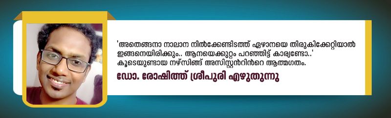 'അതെങ്ങനാ നാലാന നിൽക്കേണ്ടിടത്ത് ഏഴാനയെ തിരുകിക്കേറ്റിയാൽ ഇങ്ങനെയിരിക്കും.. ആനയെക്കുറ്റം പറഞ്ഞിട്ട് കാര്യണ്ടോ..' കൂടെയുണ്ടായ നഴ്സിങ്ങ് അസിസ്റ്റന്റിന്റെ ആത്മഗതം. ഇത് ഇതിനു മുമ്പേ ഏഴാളെ കൊന്നിട്ടുണ്ടത്രേ.. കണ്ണിനാണെ കാഴ്ച്ചേം ഇല്ല.