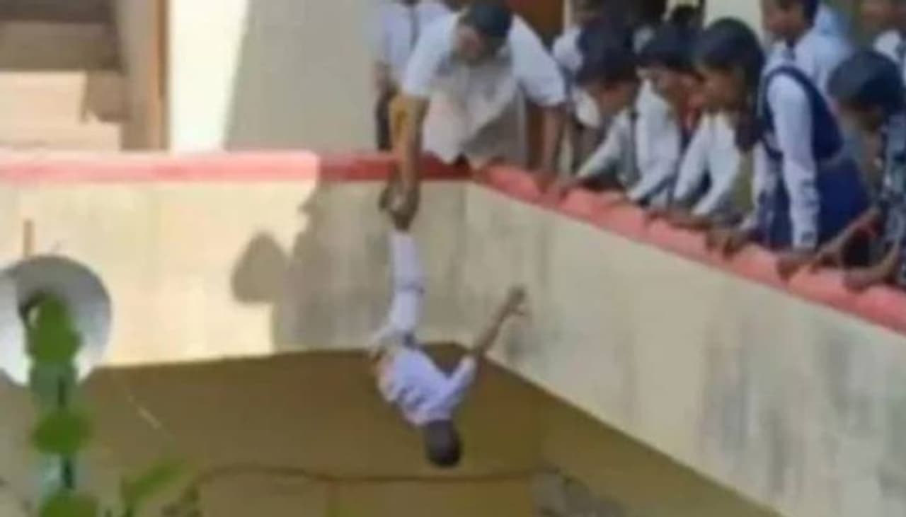പ്രിൻസിപ്പലിന്റെ പേര് മനോജ് വിശ്വകർമ. ഒക്ടോബർ 28 -ന് മിർസാപൂരിലെ അഹ്റൗറയിലുള്ള സദ്ഭാവ്ന ശിക്ഷൺ സൻസ്ഥാൻ ജൂനിയർ ഹൈസ്കൂളിലാണ് സംഭവം. രണ്ടാം ക്ലാസിൽ പഠിക്കുന്ന കുട്ടി ഭക്ഷണം കഴിക്കുന്നതിനിടെ വികൃതി കാണിച്ചതിനാണ് അധ്യാപകന്റെ ഈ ക്രൂരമായ ശിക്ഷാനടപടി. രോഷാകുലനായ പ്രിൻസിപ്പൽ വിദ്യാർത്ഥിയായ സോനു യാദവിനെ ഒന്നാം നിലയിലേക്ക് വലിച്ചിഴച്ചു. തുടർന്ന് ബാൽക്കണിയിൽ നിന്ന് തലകീഴായി തൂക്കിപ്പിടിക്കുകയായിരുന്നു. 'സോറി' പറഞ്ഞില്ലെങ്കിൽ താഴെയിടുമെന്ന് ഭീഷണിപ്പെടുത്തി.