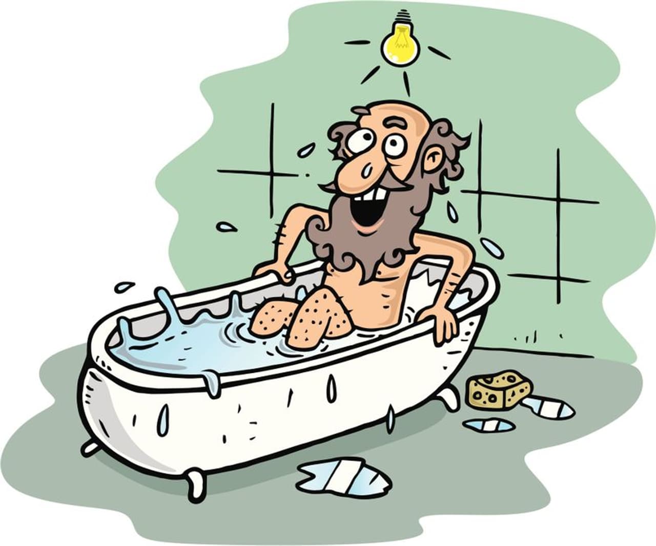 ഐസക് ന്യൂട്ടണ് തലയില് ആപ്പിള് വീണപ്പോഴാണ് ഭൂഗുരുത്വത്തെക്കുറിച്ച് ചിന്തിച്ചത് എന്ന് പറയുന്നതുപോലെ ഒരു കല്പിത കഥയാവാം ആര്ക്കിമിഡീസ് കുളിത്തൊട്ടിയില് നിന്നും യുറേക്ക ( കണ്ടു പിടിച്ചു) എന്ന് വിളിച്ചു കൊണ്ട് നഗ്നനായി ഇറങ്ങിയോടി എന്നതും.