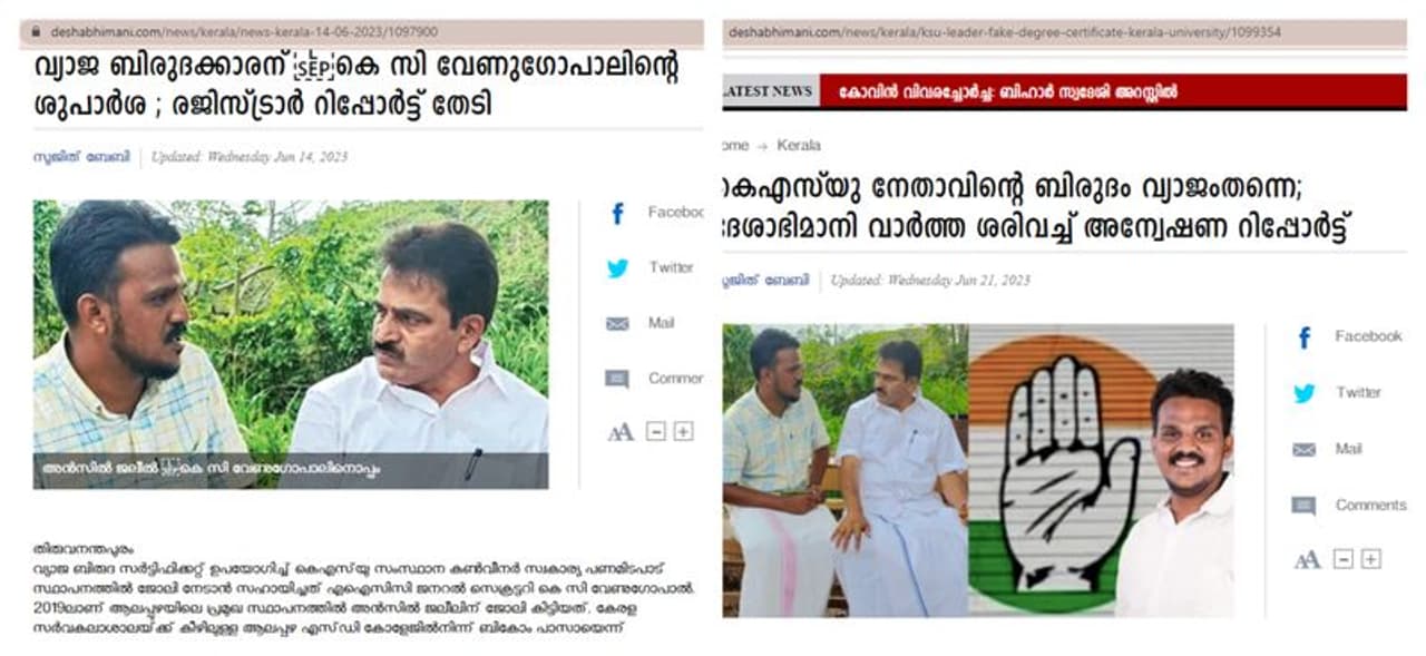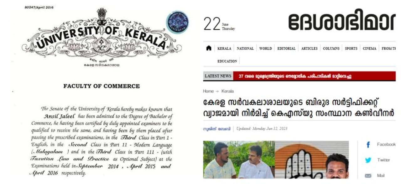 ജൂണ് 12-നാണ് ദേശാഭിമാനി പത്രത്തില് അന്സിലിനെതിരെ ആ വാര്ത്ത വന്നത്. 'കേരള സര്വകലാശാലയുടെ ബിരുദ സര്ട്ടിഫിക്കറ്റ് വ്യാജമായി നിര്മിച്ച് കെഎസ്യു സംസ്ഥാന നേതാവ്' എന്ന ആംഗിളിലായിരുന്നു ആലപ്പുഴ നിന്നുള്ള റിപ്പോര്ട്ട്. 'കേരള സര്വകലാശാലയില്നിന്ന് 2016-ല് ബികോം ബിരുദം നേടിയതായി ചമച്ച സര്ട്ടിഫിക്കറ്റുപയോഗിച്ച് ആലപ്പുഴയിലെ പണമിടപാട് സ്ഥാപനത്തില് ജോലി സമ്പാദിച്ചതായും ആക്ഷേപമുണ്ട്' എന്നും വാര്ത്തയില് പറയുന്നു. 'കേരള സര്വകലാശാലയുടെ ഔദ്യോഗിക എംബ്ലവും ലോഗോയും സീലും വൈസ് ചാന്സലറുടെ ഒപ്പും ദുരുപയോഗപ്പെടുത്തിയാണ് സര്ട്ടിഫിക്കറ്റ് തയ്യാറാക്കിയത്.' എന്നും റിപ്പോര്ട്ട് ഉറപ്പിച്ചു പറയുന്നു. വാര്ത്തയ്ക്കൊപ്പം താഴെക്കാണുന്ന ഒരു സര്ടിഫിക്കറ്റും ദേശാഭിമാനി പ്രസിദ്ധീകരിച്ചു. 2016 നവംബര് 15 തീയതിയിലുള്ള സര്ടിഫിക്കറ്റില് അന്സില് ജലീല് ബികോം പാസായി എന്നാണ് എഴുതിയിരിക്കുന്നത്.