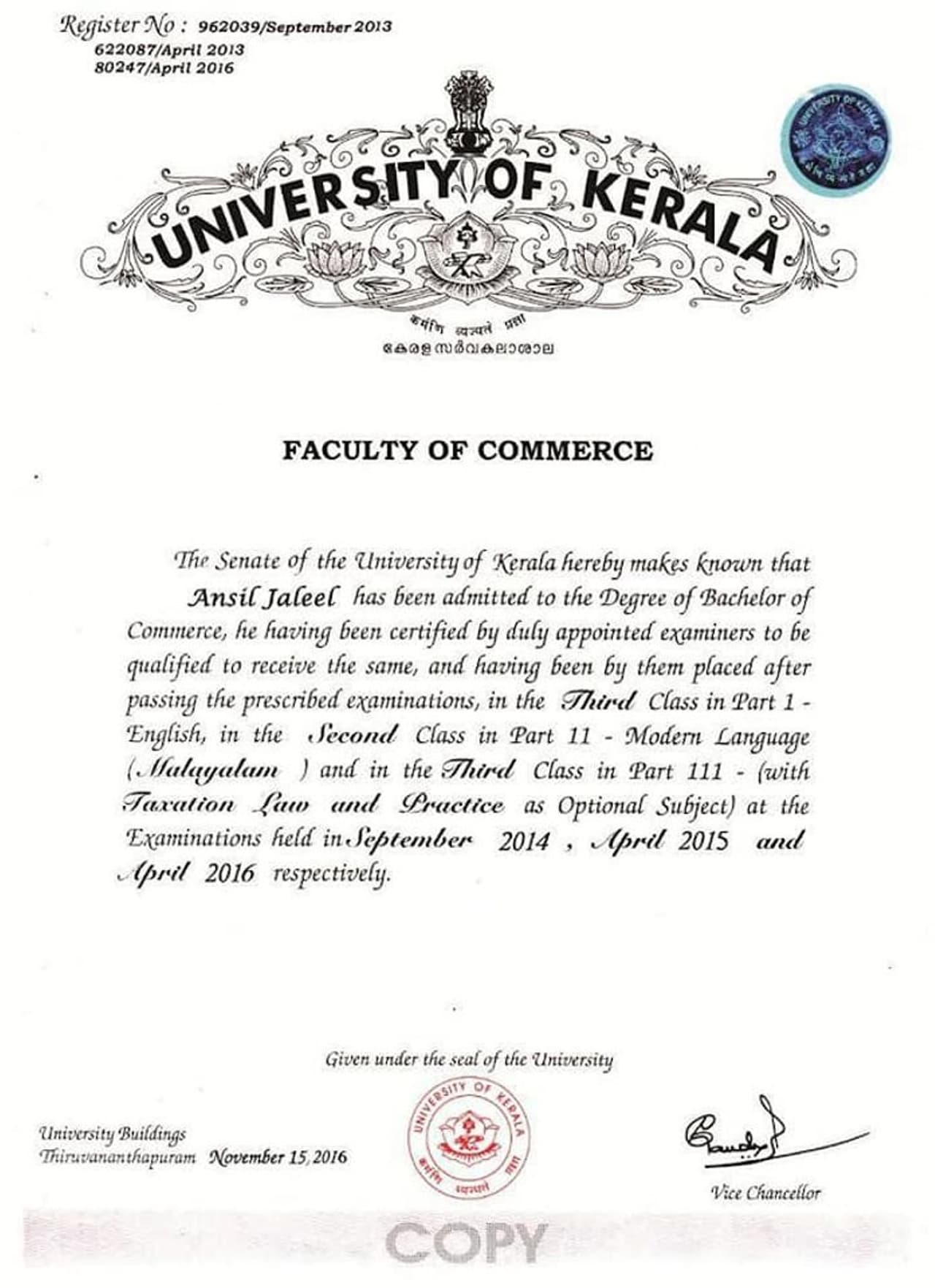 അതിനിടെയാണ്, കേരള സര്വകലാശാലയുടെ അടിയന്തിര ഇടപെടല് വന്നത്. ദേശാഭിമാനി പ്രസിദ്ധീകരിച്ച, ജലീലിന്റെ പേരിലുള്ള വ്യാജസര്ടിഫിക്കറ്റ് പരീക്ഷാ കണ്ട്രോളര് പരിശോധിക്കുകയും അത് വ്യാജമായി ഉണ്ടാക്കിയതാണെന്ന് കണ്ടെത്തുകയും ചെയ്തതായി രജിസ്ട്രാര് വാര്ത്താ കുറിപ്പിറക്കി. നിഖില് വ്യാജസര്ടിഫിക്കറ്റ് ഉണ്ടാക്കി തട്ടിപ്പ് നടത്തിയ സംഭവത്തില് യൂനിവേഴ്സിറ്റി പരാതി നല്കിയതിനൊപ്പം, അന്സിലിന്റെ വിഷയത്തിലും രജിസ്ട്രാര് പരാതി നല്കി. ദേശാഭിമാനിയില് വന്ന ഇമേജ് മാത്രം അടിസ്ഥാനപ്പെടുത്തിയുള്ള പരാതിയില് എന്തായാലും ഉടനടി പൊലീസ് നടപടി എടുത്തു. തനിക്കെതിരെ കള്ള പ്രചാരണം നടത്തുന്നുവെന്നും അതിന്റെ നിജസ്ഥിതി അന്വേഷിക്കണം എന്നുമാവശ്യപ്പെട്ട് അന്സില് നല്കിയ പരാതിയില് ഒരാഴ്ച കഴിഞ്ഞിട്ടും ഒരു നടപടിയും എടുക്കാത്ത അതേ പൊലീസാണ് ദേശാഭിമാനിയില് വന്ന ഒരു ഇമേജിനെ ചൊല്ലി സര്വകലാശാല എടുപിടീന്ന് നല്കിയ പരാതി പ്രകാരം കേസ് എടുത്തത്.