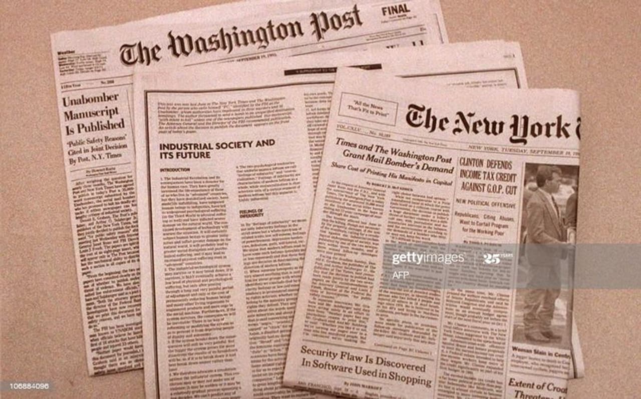 പതിനേഴു വർഷത്തെ ആക്രമണങ്ങൾക്കു ശേഷം, തന്നെ തേടി എഫ്ബിഐ വാലിൽ തീപിടിച്ച് ഓടിക്കൊണ്ടിരിക്കെ, 1995 -ൽ തിയോഡോർ കാസിൻസ്കി തന്റെ ടൈപ്പ് റൈറ്ററിൽ ടൈപ്പ് ചെയ്തെടുത്ത 35,000 വാക്കുകളുള്ള, 78 പേജ് വരുന്ന, Industrial Society and Its Future. ഒരു സുദീർഘ ലേഖനം, വാഷിങ്ടൺ പോസ്റ്റ്, ന്യൂയോർക്ക് ടൈംസ് എന്നീ പത്രങ്ങൾക്ക് അയച്ചു നൽകി. അത് പ്രസിദ്ധപ്പെടുത്തിയാൽ തന്റെ പോസ്റ്റൽ ബോംബിങ് നിർത്താം എന്നായിരുന്നു കാസിൻസ്കിയുടെ ഓഫർ. ആ മാനിഫെസ്റ്റോയിലെ എഴുത്തിന്റെ ശൈലി കണ്ടെങ്കിലും ആരെങ്കിലും ആളെ തിരിച്ചറിഞ്ഞാലോ എന്ന് കരുതി രണ്ടു പത്രങ്ങളും സ്പെഷ്യൽ സപ്ലിമെന്റായി കാസിൻസ്കിയുടെ ആ ലേഖനം പ്രസിദ്ധപ്പെടുത്തി. പ്രസ്തുത ലേഖനത്തിൽ കാസിൻസ്കി മുതലാളിത്തത്തിന്റെ നീരാളിക്കൈകളിൽ പിടയുന്ന സമൂഹത്തെക്കുറിച്ചും മനുഷ്യരെക്കുറിച്ചുമുള്ള തന്റെ ആശങ്കകൾ വെളിപ്പെടുത്തിയിരുന്നു. ഫ്രീഡം ക്ലബ്ബ് (FC) എന്ന ഒരു പ്രസ്ഥാനമാണ് അന്നോളം നടന്ന പോസ്റ്റൽ ബോംബ് ആക്രമണങ്ങൾക്ക് പിന്നിലെന്ന് ധ്വനിപ്പിക്കാൻ വേണ്ടിയാകും, ആ ലേഖനത്തിലുടനീളം മനഃപൂർവം 'ഞങ്ങൾ' എന്നാണ് പരാമർശിച്ചിരുന്നത്. ആ മാനിഫെസ്റ്റോയിലൂടെയാണ് അതുവരെയുള്ള ബോംബുകളിൽ പതിച്ചിരുന്നു FC എന്ന ചുരുക്കപ്പേരിന്റെ പൂർണ്ണരൂപം 'ഫ്രീഡം ക്ലബ്ബെ'ന്നാണ് എന്ന് എഫ്ബിഐ സ്ഥിരീകരിക്കുന്നത്. അതിൽ വാഹനങ്ങൾ, ടെലിവിഷൻ തുടങ്ങി മനുഷ്യന്റെ സൗകര്യത്തിനും സുഖത്തിനും വേണ്ടി എന്ന പേരിൽ മുതലാളിത്തം സമൂഹത്തിൽ അവതരിപ്പിച്ച പല യന്ത്രങ്ങളും പിന്നീട് എങ്ങനെയാണ് മനുഷ്യരെ നിയന്ത്രിക്കാനും, ഒരർത്ഥത്തിൽ അടിമകളാക്കാനും തുടങ്ങിയത് എന്നത് സംബന്ധിച്ചുള്ള കാസിൻസ്കിയുടെ വീക്ഷണങ്ങൾ വിശദീകരിച്ചിരുന്നു.