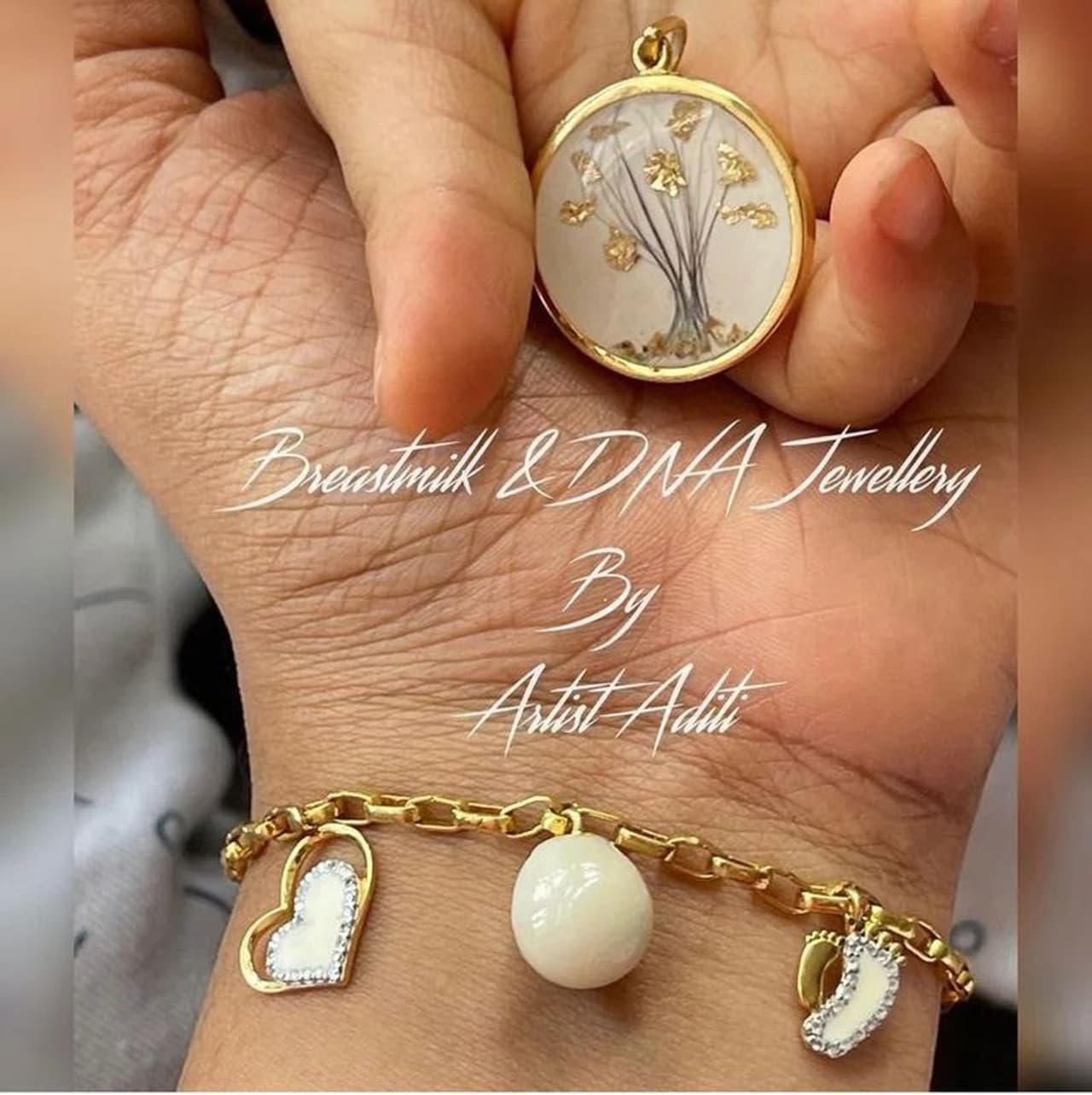 സ്വര്ണ്ണം, വെള്ളി എന്നിവ കൊണ്ടുള്ള ആഭരണങ്ങളാണ് മുലപ്പാല് ഉപയോഗിച്ച് അദിതി ഡിസൈന് ചെയ്യുന്നത്.