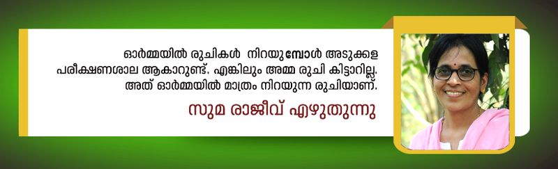ഓര്മ്മയില് രുചികള് നിറയുമ്പോള് അടുക്കള പരീക്ഷണശാല ആകാറുണ്ട്. എങ്കിലും അമ്മ രുചി കിട്ടാറില്ല. അത് ഓര്മ്മയില് മാത്രം നിറയുന്ന രുചിയാണ്