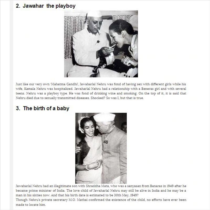 നെഹ്റു എന്ന പ്ളേബോയ് : 'ദി വോയ്സ് ഓഫ് ദി നേഷൻ' - ലോകത്തിന്റെ മറുവശം പേരിൽ ഹ്രസ്വകാലത്തേക്കു മാത്രം ഇന്റർനെറ്റിൽ ഉണ്ടായിരുന്ന ഒരു വെബ്സൈറ്റിലാണ് നെഹ്രുവിന്റെ പ്രണയലീലകളെപ്പറ്റിയുള്ള പരദൂഷണങ്ങൾ പ്രത്യക്ഷപ്പെട്ടത്. അതിൽ സരോജിനി നായിഡുവിന്റെ മകൾ പത്മജ നായിഡുവുമായും, മൗണ്ട് ബാറ്റന്റെ പത്നി എഡ്വിനയുമായും ഒക്കെ നെഹ്റുവിനെ ബന്ധപ്പെടുത്തിക്കൊണ്ടുള്ള കഥകളുണ്ടായിരുന്നു. കമലാ നെഹ്റു രോഗഗ്രസ്തയായി ശയ്യാവലംബിയായ കാലത്ത് നെഹ്റു പരസ്ത്രീകൾക്കു പിന്നാലെ പോവുകയായിരുന്നു എന്നായിരുന്നു ആരോപണം. വാരണാസിയിലെ ശ്രദ്ധാ മാതാ എന്ന ഒരു സന്യാസിനിയിൽ നെഹ്റുവിന് ഒരു കുഞ്ഞുണ്ടായിരുന്നു എന്നുവരെ എത്തി കഥ. നെഹ്രുവിന്റെ മുത്തച്ഛൻ ഗിയാസുദ്ദീൻ ഗാസി എന്ന മുഗളൻ ആണെന്നുവരെ ഇതിൽ പറഞ്ഞിട്ടുണ്ട്.