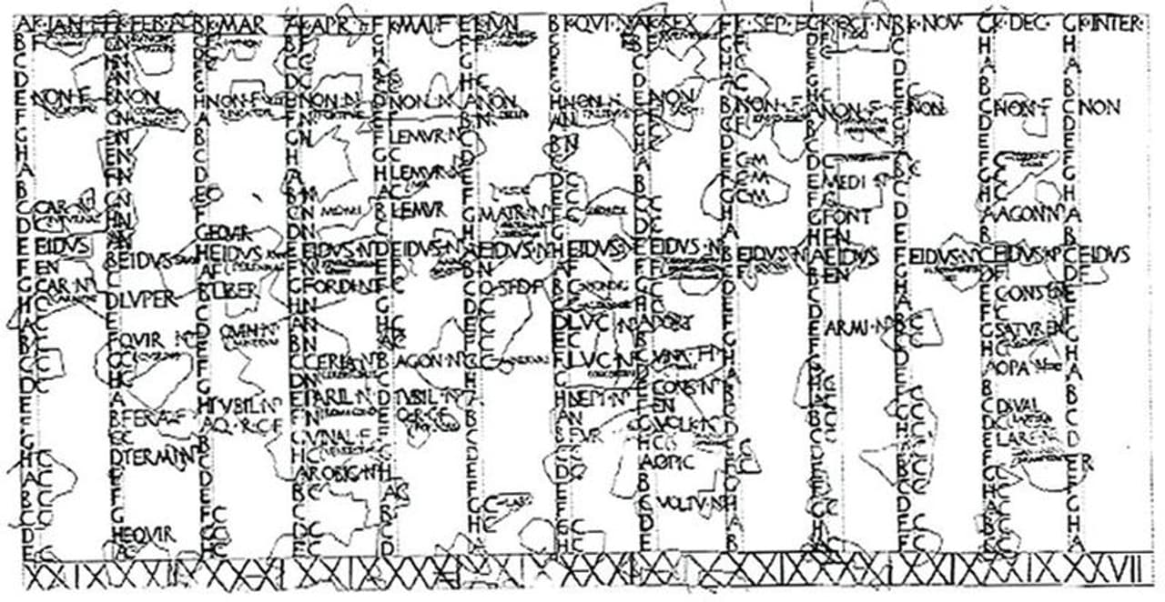 'ആന്റിയത്തിലെ നീറോയുടെ ഭവനത്തിന്റെ അവശിഷ്ടങ്ങളിൽ നിന്ന് കണ്ടെടുത്ത റോമൻ കലണ്ടർ. ഏറ്റവും മുകളിലെ വരിയിൽ മാസങ്ങളുടെ പേര് എഴുതിയത് കാണാം.'
