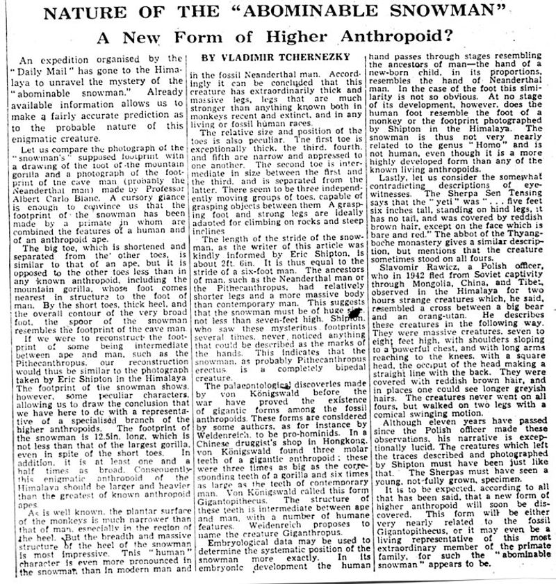 യതി അന്വേഷകരുടെ കുതൂഹലത്തിനു പാത്രമാവുന്നത് ഇത് ആദ്യമായൊന്നുമല്ല. 1954 -ൽ പങ്ക്ബോച്ചേ ബുദ്ധവിഹാരത്തിനടുത്തുവെച്ച് യതിയുടേതെന്ന് സംശയിക്കപ്പെടുന്ന ഒരു തലയോട്ടിയുടെ ഭാഗവും, തലമുടിയുടെ അവശിഷ്ടങ്ങളും കണ്ടെടുത്തു എന്ന വാർത്ത വരുന്നത് ഡെയ്ലി മെയ്ൽ പത്രത്തിലാണ്. പത്രം താനെ സംഘടിപ്പിച്ചതായിരുന്നു ആ പര്യവേക്ഷണം. വ്ലാദിമിർ ചെർനെസ്കി ആണ് അന്ന് ആ ലേഖനമെഴുതിയത്. അതിൽ യതിയെ വിശേഷിപ്പിച്ചത് 'Abominable Snowman ', ' Higher Anthropoid' എന്നൊക്കെയായിരുന്നു. അന്ന് ആ മുടിനാരിഴകൾ പരിശോധിച്ച പ്രശസ്ത ശാസ്ത്രജ്ഞൻ ഫ്രഡറിക് വുഡ് ജോൺസിന് കൃത്യമായി അത് ഏതെങ്കിലും മൃഗത്തിന്റെതുമായി സാമ്യപ്പെടുത്താനായില്ല. 1956-ൽ സ്ലാവോമിർ റാവിച്ച് എഴുതിയ 'ദി ലോങ്ങ് വാക്ക്' എന്ന പുസ്തകത്തിലും യതീസമാനമായ ഏതോ ഒരു അജ്ഞാത ജീവിയെ നേരിൽ കണ്ടതിന്റെ രസകരമായ വർണനകളുണ്ട്.