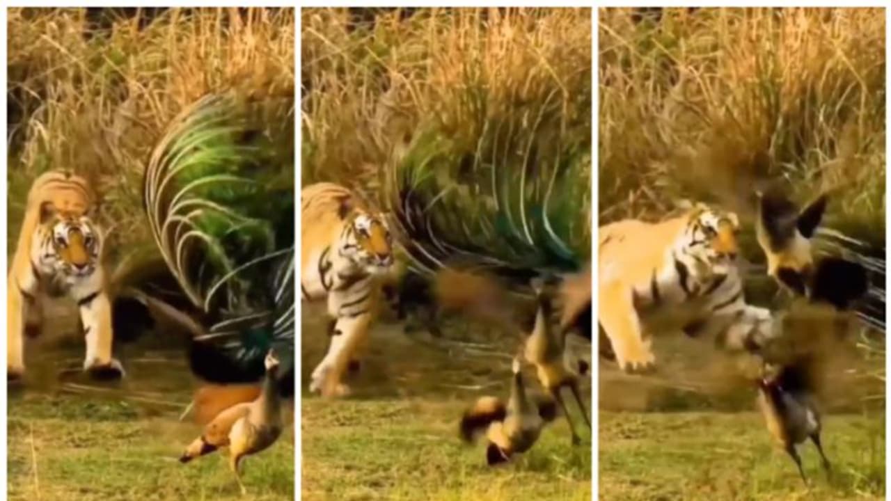 കടുവയേയും മയിലിനെയും സംബന്ധിച്ച് ഒരു ആവാസവ്യസ്ഥയിലെ ഭക്ഷ്യശൃംഖലയില് ഉള്പ്പെടുന്ന രണ്ട് ജീവിവര്ഗ്ഗങ്ങള് മാത്രമാണ്. സ്വാഭാവികമായും കാട്ടിലെ വേട്ടക്കാരനായ കടുവ, തന്റെ ഇരകളിലൊന്നായ മയിലിനെ വേട്ടയാടുന്നതാണ് വീഡിയോയില് ഉള്ളത്. ഒരു കൂട്ടം മയിലുകള് ഒരു പുല്ക്കാട്ടിനിടയില് എന്തോ കൊത്തി പെറുക്കുന്നതിനിടെ പുറകിലൂടെ വരുന്ന കടുവ കൂട്ടത്തിലെ ആണ് മയിലിന് നേരെ ഉയര്ന്നു ചാടുന്നു. ഒപ്പം തന്റെ മുന്കൈയിലെ നഖങ്ങള് കൂര്പ്പിച്ച് വീശുന്നു.
