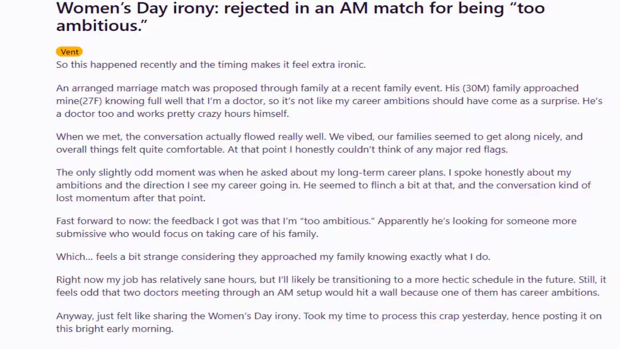 പിന്നീട് യുവാവിന്റെ വീട്ടുകാർ വിവാഹാലോചന വേണ്ടെന്ന് വച്ചു. അവർക്ക് വേണ്ടത് കുടുംബത്തിന് മുൻഗണന നൽകുന്ന, അനുസരണയുള്ള ഒരാളെയാണെന്നും യുവതിയുടെ കരിയർ മോഹങ്ങൾ അതിന് തടസ്സമാണെന്നുമായിരുന്നു അവരുടെ മറുപടി. 'രണ്ട് ഡോക്ടർമാർ തമ്മിലുള്ള വിവാഹാലോചനയിൽ ഒരാൾക്ക് കരിയർ ലക്ഷ്യങ്ങളുണ്ട് എന്നത് ഒരു തടസ്സമായി മാറുന്നത് വിചിത്രമായി തോന്നുന്നു' എന്നാണ് യുവതി കുറിച്ചത്.