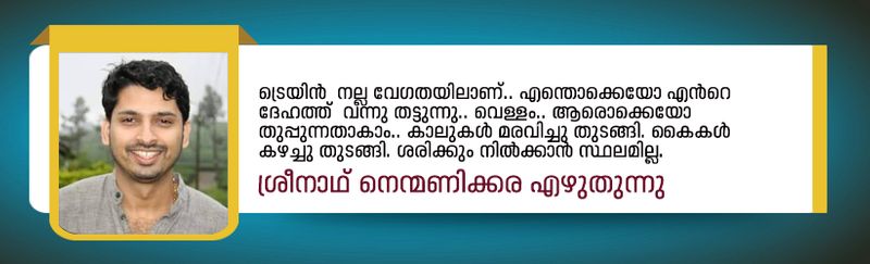 "ഞാന് ഇപ്പോള് ചാകും.. നിങ്ങടെ മകനെ പോലെ വിചാരിച്ചു തുറക്ക്. ടി ടി യെ വിളിച്ചോണ്ട് വാ.. അയ്യോ.. ഒന്ന് തുറക്ക് പ്ലീസ്.. ഒന്നുമില്ലെങ്കില് നമ്മള് മലയാളികളല്ലേ.. എന്നെ കൊല്ലല്ലേ അയ്യോ..'' അപ്പോഴേക്കും എന്റെ ശബ്ടം ഇടറിത്തുടങ്ങിയിരുന്നു.. തീവണ്ടി പുറപ്പെട്ടതിൽ ഏറ്റവും വേഗത്തിലും. എനിക്ക് പുറത്തേക്കു നോക്കാന് ഭയമായിരുന്നു. ഞാന് വാതിലിന്റെ ജനലില് കയ്യിട്ട് പിടിച്ച് തീവണ്ടിയോടു ചേര്ന്ന് നിന്നു. ദൈവത്തെ വിളിച്ചു.. ഇതിനിടയില് കക്കൂസില് പോകുന്ന യാത്രക്കാര് എന്നെ ജനലില് കൂടി നോക്കിപ്പോകുന്നു. ഞാന് വിണ്ടും കെഞ്ചിക്കൊണ്ടിരുന്നു. ഒരു വിദ്വാന് രണ്ടു പായ പത്രവുമായി ഞാന് കിടക്കുന്ന വാതിലിനുള്വശം നേരെ ഉറങ്ങാന് കിടന്നു. ഞാന് അവനെയും തട്ടി വിളിച്ചു, തുറക്കുന്നില്ല..