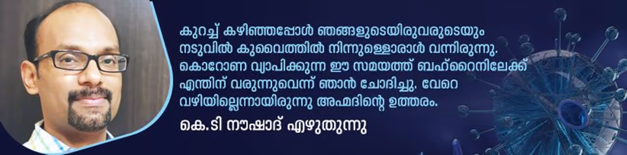 അദ്ദേഹത്തിന്റെ കൂടെ ജോലി ചെയ്തതിനാലും വിമാനത്തില് യാത്ര ചെയ്തതിനാലും വീട്ടിലേക്ക് പോകും മുമ്പ് ടെസ്റ്റിന് അവസരം കിട്ടിയാല് അത് ചെയ്യണമെന്നുറപ്പിച്ചാണ് വിമാനത്തിലിരുന്നത്. അഥവാ വൈറസ് ബാധയുണ്ടെങ്കില് വീട്ടിലെ ചെറിയ മക്കള്ക്കൊന്നും അത് പകരേണ്ടല്ലോ എന്നായിരുന്നു ചിന്ത. വിമാന സര്വീസ് നിര്ത്തി വെക്കാതെ ബഹ്റൈന് വൈറസിനെ പ്രതിരോധിക്കുന്നതങ്ങനെ എന്നറിയാനും ആകാംക്ഷയുണ്ടായിരുന്നു. വിമാനമിറങ്ങിയപ്പോള് ബഹ്റൈന് എയര്പോര്ട്ടില് കണ്ട പ്രതിരോധ സംവിധാനങ്ങള് സന്തോഷം നല്കുന്നതായിരുന്നു. നേരില് കണ്ട ആ സംവിധാനങ്ങളാണ് 'ട്രാവല് ഉലകം' യൂടൂബ് ചാനലില് വിവരിച്ചത്. അതിന്റെ ലിങ്ക് താഴെ.