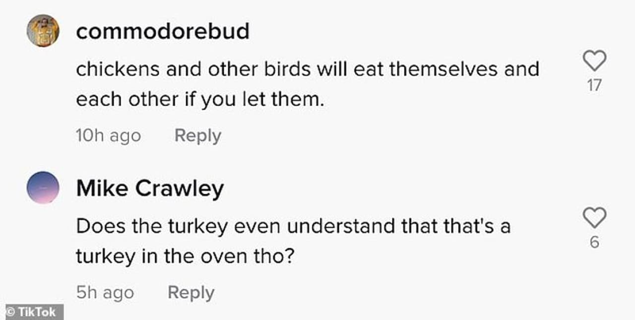 ഒരു മനുഷ്യനെ മറ്റൊരു മനുഷ്യന് മുന്നില് വച്ച് പാചകം ചെയ്യുന്നതിനെ കുറിച്ചോര്ത്ത് നോക്കൂ. അയാളെ നിങ്ങള്ക്ക് അറിയില്ലെങ്കില് അത് ഓക്കേയാണോ എന്നാണ് മറ്റൊരാള് ചോദിച്ചത്. എന്നാല്, വീഡിയോ പോസ്റ്റ് ചെയ്ത സ്ത്രീ പിന്നീട് ബിഗ് റെഡ് എന്ന തന്റെ ടര്ക്കിക്ക് അത് വേദനയൊന്നും നല്കിയില്ല എന്നും അതിന് തിന്നാന് കൊടുക്കാത്തതിലുള്ള ദേഷ്യമേ ഉണ്ടായിരുന്നുള്ളൂ എന്നും വിശദീകരിച്ചു. അതിനോടും പലരും കോഴികളടക്കം തങ്ങളുടെ തന്നെ ഇനത്തെ പാചകം ചെയ്തുകൊടുത്താൽ കഴിക്കും എന്ന് എഴുതി. ഏതായാലും മറ്റനേകം പേർ കമന്റ് ബോക്സിലെത്തിയത് കുറേയേറെ തമാശകളുമായിട്ടാണ്. എന്നിരുന്നാലും വളരെ പെട്ടെന്ന് തന്നെ വീഡിയോ വൈറലായി.