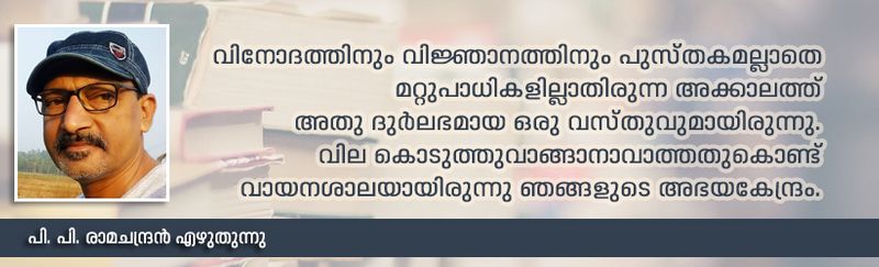 വിനോദത്തിനും വിജ്ഞാനത്തിനും പുസ്തകമല്ലാതെ മറ്റുപാധികളില്ലാതിരുന്ന അക്കാലത്ത് അതു ദുര്ലഭമായ ഒരു വസ്തുവുമായിരുന്നു. വില കൊടുത്തുവാങ്ങാനാവാത്തതുകൊണ്ട് വായനശാലയായിരുന്നു ഞങ്ങളുടെ അഭയകേന്ദ്രം. ദരിദ്രയെങ്കിലും ഉള്ളതുകൊണ്ട് മക്കളെ ഊട്ടുന്ന വാത്സല്യനിധിയായ ഒരമ്മയെപ്പോലെയായിരുന്നു ഞങ്ങളുടെ വായനശാല. ഭൗതികസൗകര്യങ്ങള് നന്നേ കുറവ്. ശവപ്പെട്ടി കുത്തനെ നിര്ത്തിയതുപോലെ വലുപ്പക്രമമില്ലാത്ത ഏതാനും മരയലമാരകള്. പക്ഷെ, അവയില് ജീവനുള്ള പുസ്തകങ്ങള് ഞാന് മുന്നേ, ഞാന് മുന്നേ എന്ന് കൈകളിലേക്ക് എടുത്തുചാടാന് കുതറിനിന്നു.