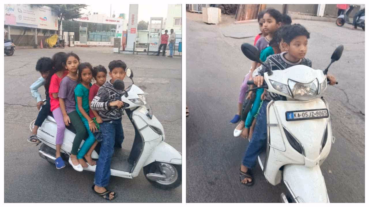 10 -നും 12 -നും ഇടയിൽ പ്രായമുള്ള ആറ് കുട്ടികൾ ഒരു സ്കൂട്ടറിൽ ഒന്നിന് പിന്നിൽ ഒന്നെന്ന രീതിയിൽ ഇരുന്ന് ബെംഗളൂരൂ നഗരത്തിലൂടെ പാഞ്ഞ് പോകുന്ന വീഡിയോ സമൂഹ മാധ്യമങ്ങളിൽ വൈലായി. ഇന്നലെ (26.4.'26) ആണ് സംഭവം. വീഡിയോ സമൂഹ മാധ്യമങ്ങളിൽ വൈറലായതിന് പിന്നാലെ കുട്ടികളുടെ മാതാപിതാക്കളെ കണ്ടെത്തി ശിക്ഷിക്കണമെന്ന ആവശ്യം സമൂഹ മാധ്യമങ്ങളിൽ ശക്തമായി. ഒപ്പം നഗരത്തിലെ ട്രാഫിക് പോലീസ് എവിടെയെന്നും സമൂഹ മാധ്യമ ഉപയോക്താക്കൾ ആരാഞ്ഞു.
